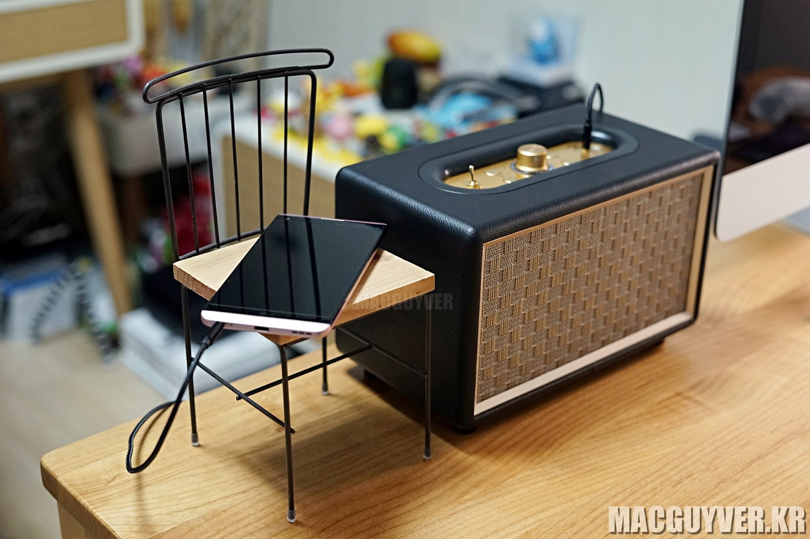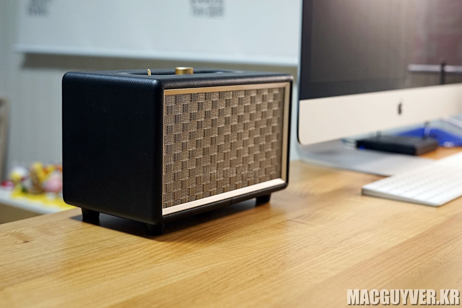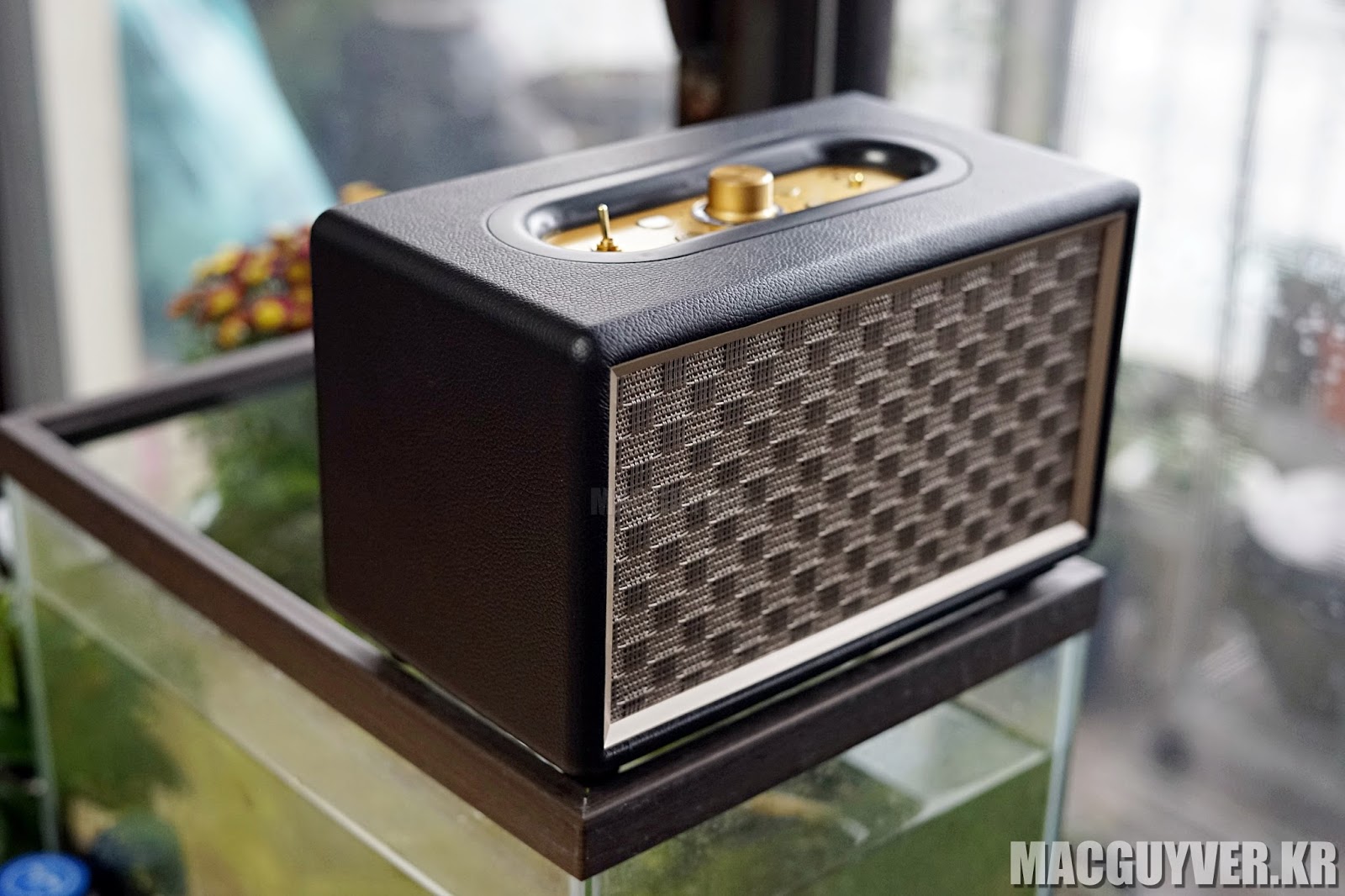 디자인에 대해서도 할 말은 많다. 우선은 일반적인 플라스틱으로 보이는 마감이 아닌 가죽 느낌의 마감과 세밀한 스피커 천의 디자인과 재질은 이 제품의 고급스러움을 더해줬고 상단부에 위치한 아날로그의 향수가 느껴지는 디자인도 매우 마음에 들었다.