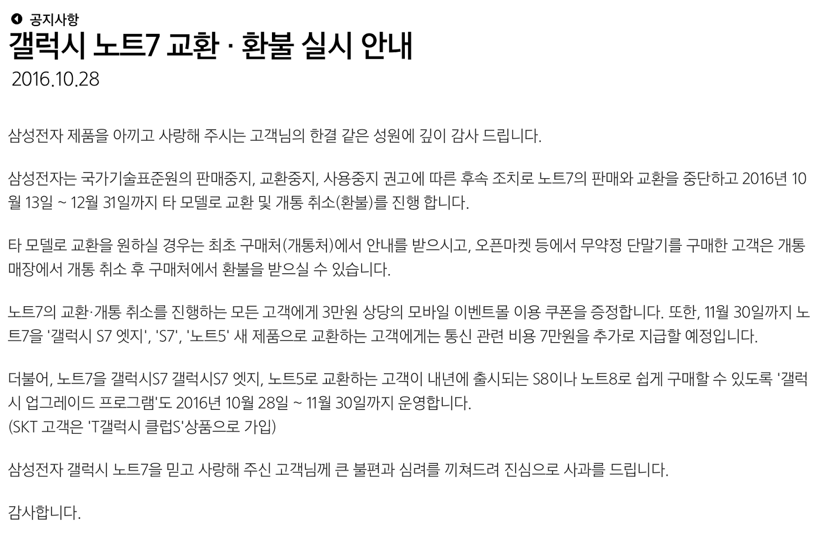 가장 큰 문제는 삼성이 실수를 했고 그로 인해서 소비자들이 피해를 보고 있음에도 불구하고 삼성이 그에 합당한 보상을 해주지 않고 있다는 것이다. 대다수의 소비자들이 노트7을 최상위 기종이라 생각하지만, 삼성은 그 아래 제품으로만 가라고 하는 상황.