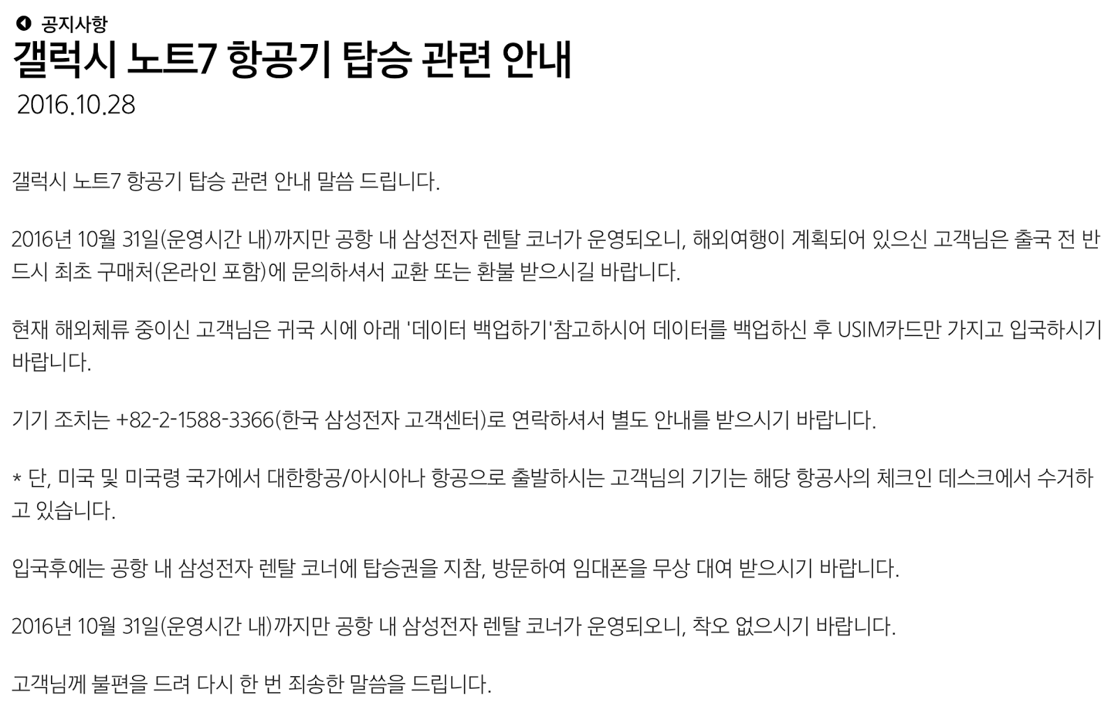 이런 상황에서, 삼성은 공항에서 지급했던 대여폰 서비스를 오는 10월 31일까지 마무리를 짓겠다는 발표를 28일이 되어서야 했고, 새벽에는 강제 업데이트로 모든 갤럭시노트7의 배터리 충전량을 60%로 제한했다.