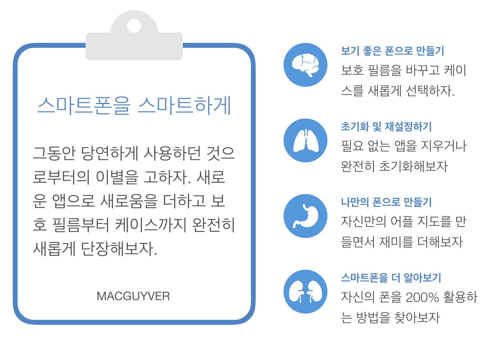 이미 있는 것을 200% 활용하는 것은 스마트폰을 새롭게 정의하고 즐거움을 찾도록 도와줄지 모르며, 자꾸만 구식이라 느껴지던 자신의 폰을 다시 바라볼 수 있는 시각을 선사할지 모른다. 이제, 지금 사용하는 스마트폰을 새로운 시각으로 바라보는 것은 어떨까. - MACGUYVER.