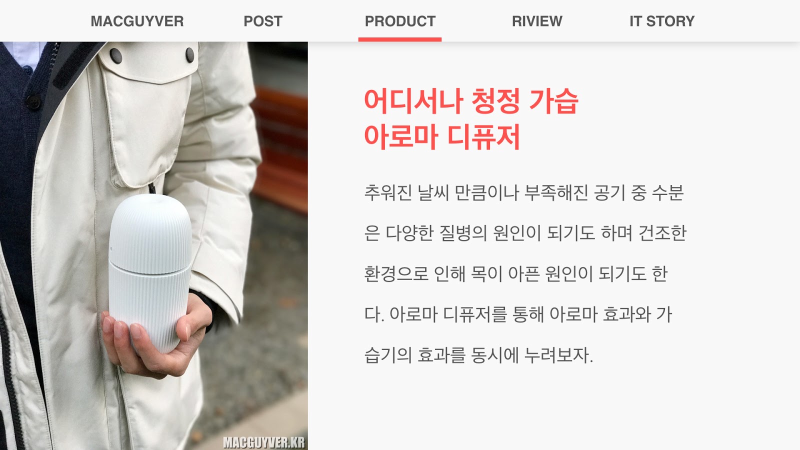 본격적으로 추위가 시작될 올겨울, 엔보우 아로마 디퓨저와 함께라면 어디서든 향기로운 향과 함께 수증기를 통해 건강도 챙기고 보다 산뜻한 기분을 느낄 수 있지 않을까 싶은 이유다. - MACGUYVER.