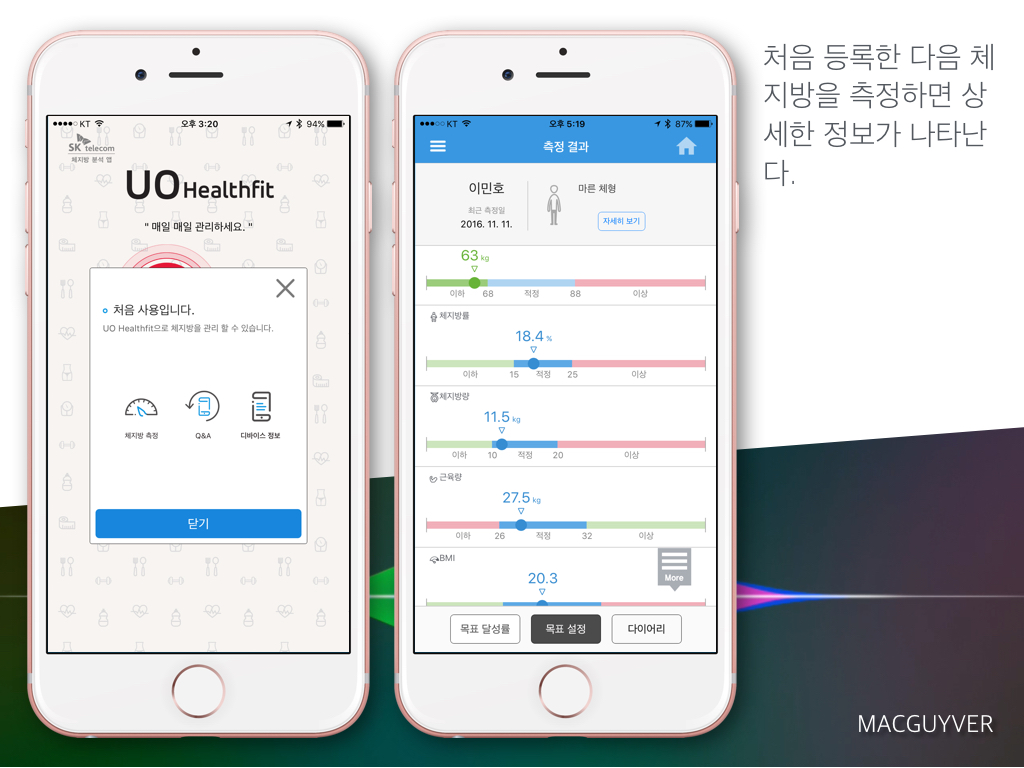휴대가 간편하게 출시된 제품으로, 어디서나 가볍게 사용할 수 있는 체지방측정기 UO 헬스핏을 통해 건강을 늘 관리하고 점검하면서 자신에게 맞는 최적의 생활 패턴을 찾아볼 것을 추천한다. - MACGUYVER.