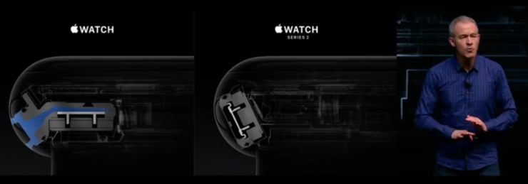 그림에서처럼 이전 애플워치를 포함해 일반적인 방수 기기들은 스피커가 꽤 깊숙한 곳까지 연결되어 있어서 물이 쉽게 빠지지 않지만, 애플워치2는 스피커 유닛을 바깥쪽으로 가져와 가만히 놔두어도 물이 빠지도록 설계했다.