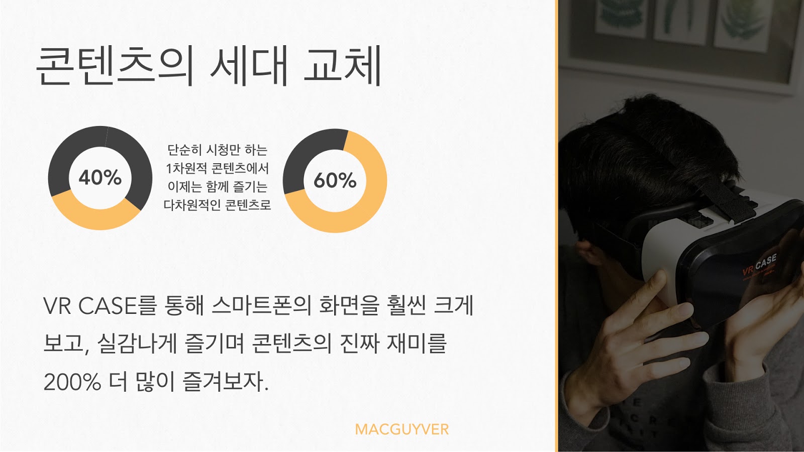 그래서 VR CASE 5 PLUS는 매우 저렴한 가격임에도 품질을 놓치지 않았다는 점에서, 또한 착용감이 우수하고, VR의 핵심이라 부를 수 있는 스마트폰 거치 환경과 VR 각도 및 렌즈가 만족스럽다는 점에서 합격점을 줄 수 있었다. 자신의 환경을 잘 돌아보고 자신에게 맞는 VR 기기를 선택해서 5인치 스마트폰을 50인치로 크게 보는 경험을 해볼 것을 추천한다. - MACGUYVER.
