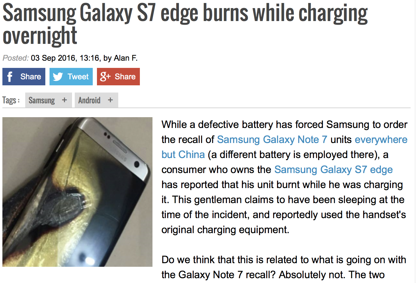 그러다 찾아본 갤럭시S7 시리즈의 폭발 및 발화 사건은 무려 29건에 이르렀는데, 가장 최근에 있었던 갤럭시S7 엣지 폭발 역시 보는 눈앞에서 폭발이 일어났고, 갤럭시노트7과 마찬가지로 배터리 부분을 중심으로 심각하게 타버린 모습을 발견할 수 있었다.