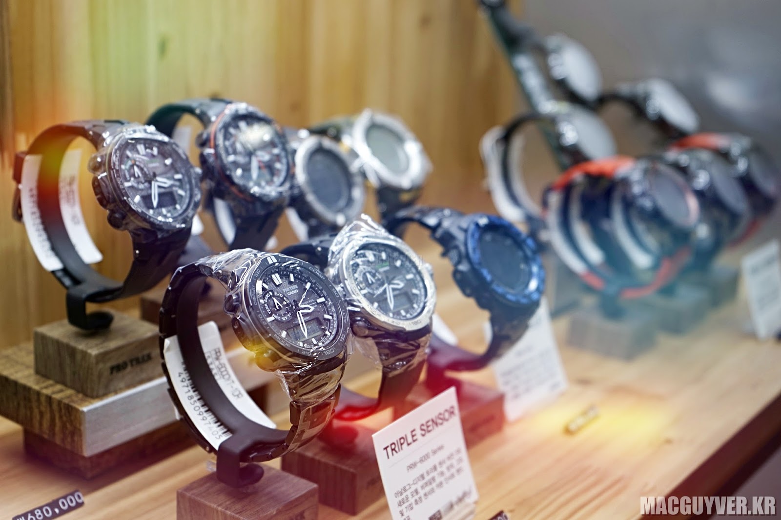 매장의 인테리어는 전체적으로 벽면을 중심으로 제품군에 맞춰서 진열이 되어 있었고, 비싼 고가의 제품과 중저가의 제품들이 자유롭게 섞여 있었는데 나름의 다양한 코디를 통해 시계의 스타일을 제대로 드러내기도 했고, 특히나 PROTREK은 제품의 특징을 잘 살리기 위해서 나무 원목으로 만들어진 진열대가 매우 인상적이었다.