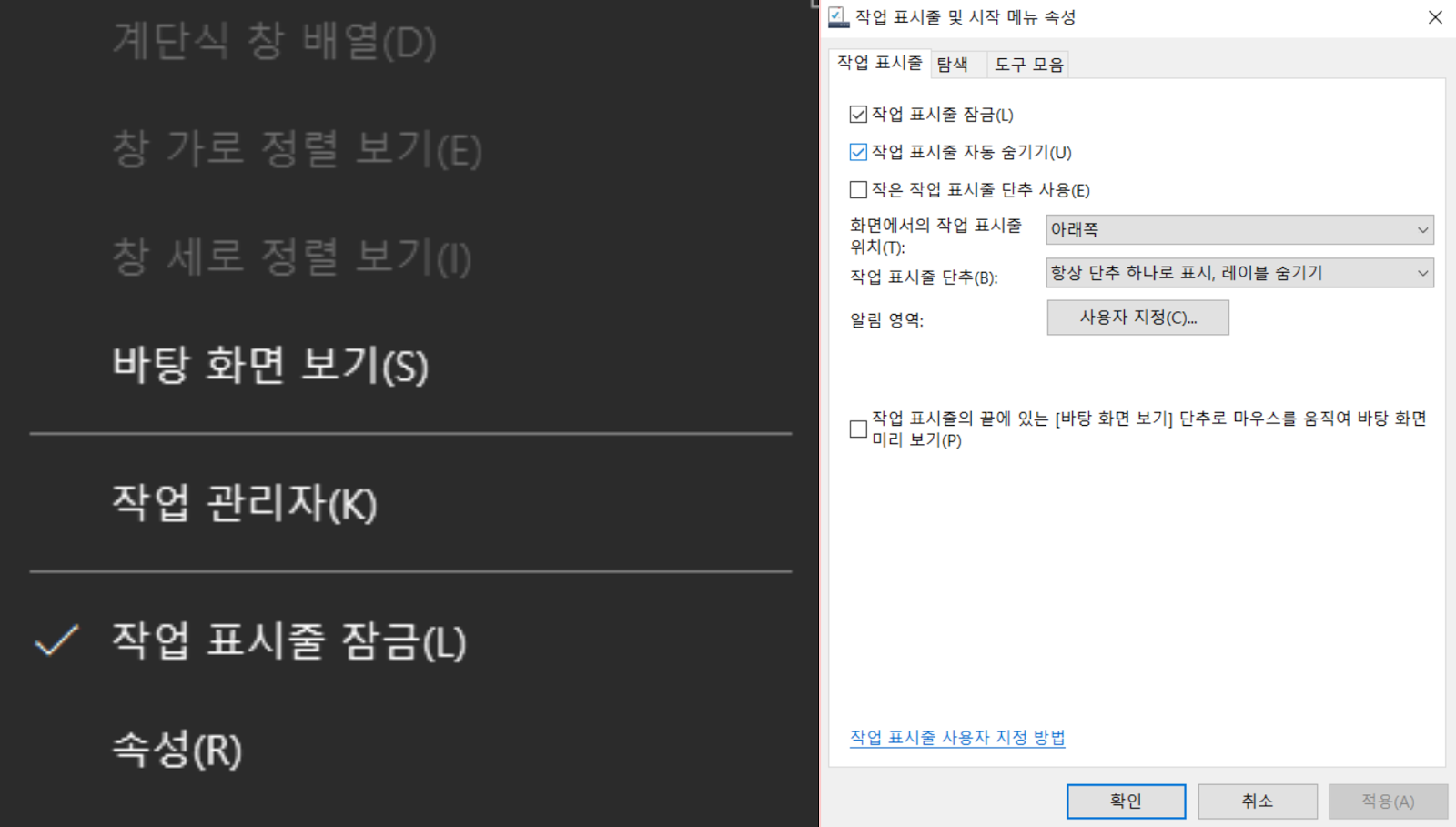 작업표시줄을 우클릭하고, 속성을 눌러보자. 그리고 위에서 두 번째 체크박스가 있는 '작업표시줄 자동 숨기기'를 체크하고 적용하면 끝이다.
