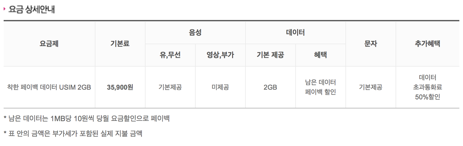 앞서 소개가 되었듯, 기본적인 혜택이 동일하고, 페이백을 모두 받는다고 가정할 경우라면 언제나 35,900원의 착한 페이백 데이터 USIM 2기가 요금제가 적어도 1,000원은 더 저렴하다.