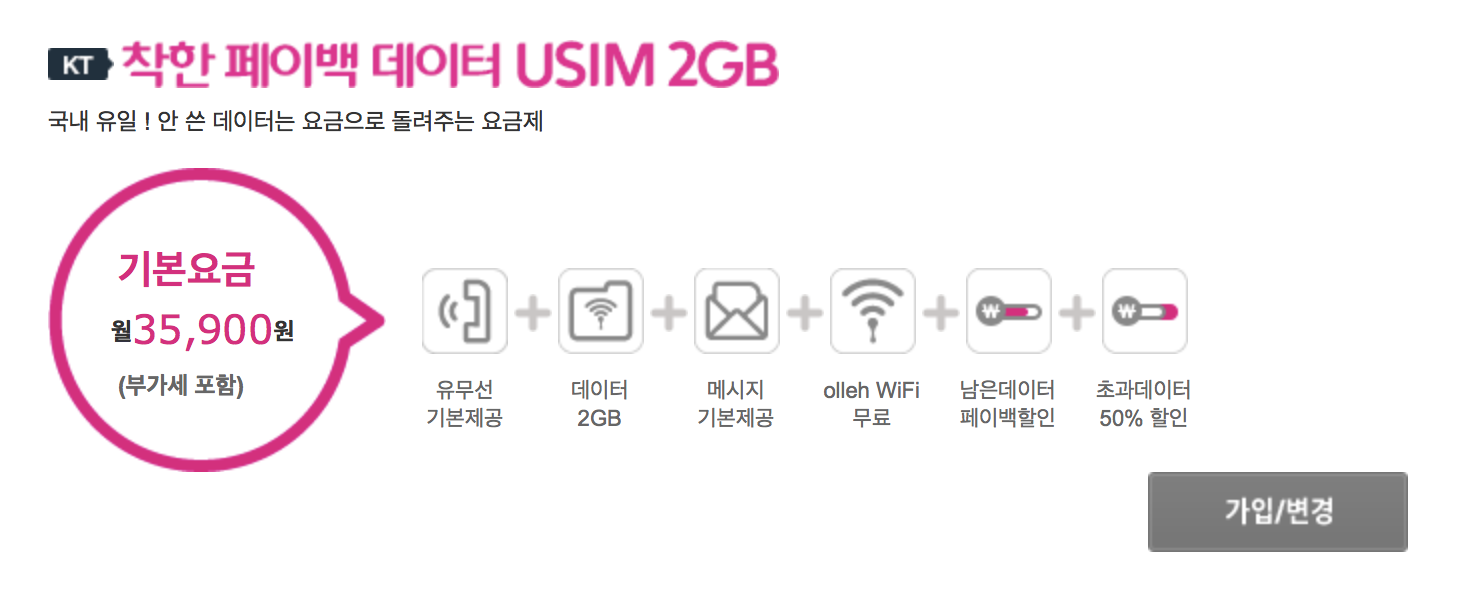 착한 페이백 데이터 USIM 요금제는 기본적으로 유무선 무료 통화 제공과 메시지 기본제공, 올레 와이파이를 무료로 제공하며 남은 데이터를 1MB에 10원으로 페이백해주며, 초과 데이터는 50% 할인을 해주는 착해도 너무 착한 요금제다.