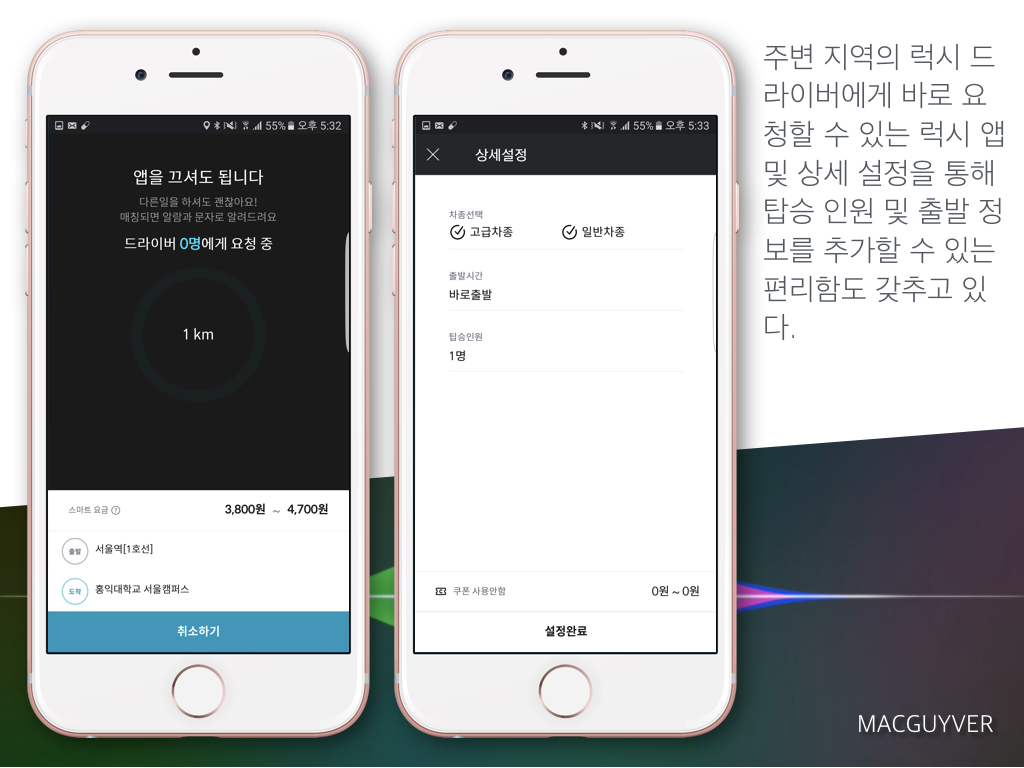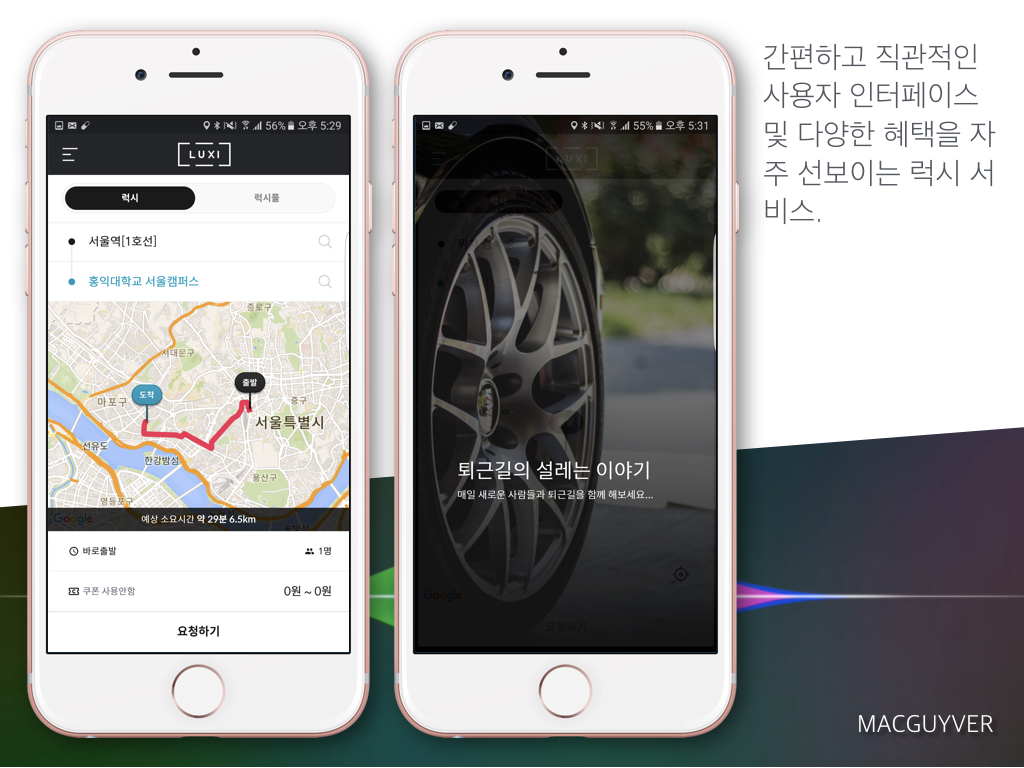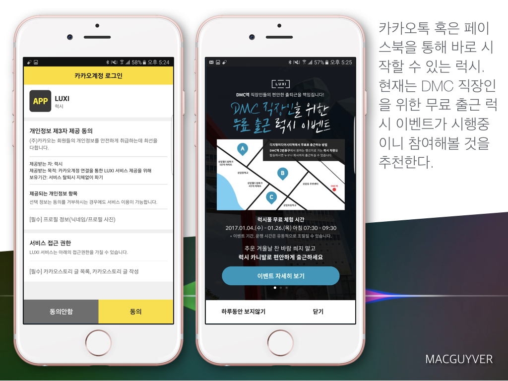 다른 카풀 앱보다 훨씬 더 믿을 수 있고 다양한 이벤트 기회까지 주어지는 럭시와 함께라면 출퇴근 문화가 완전히 바뀔지도 모르겠다. - MACGUYVER.