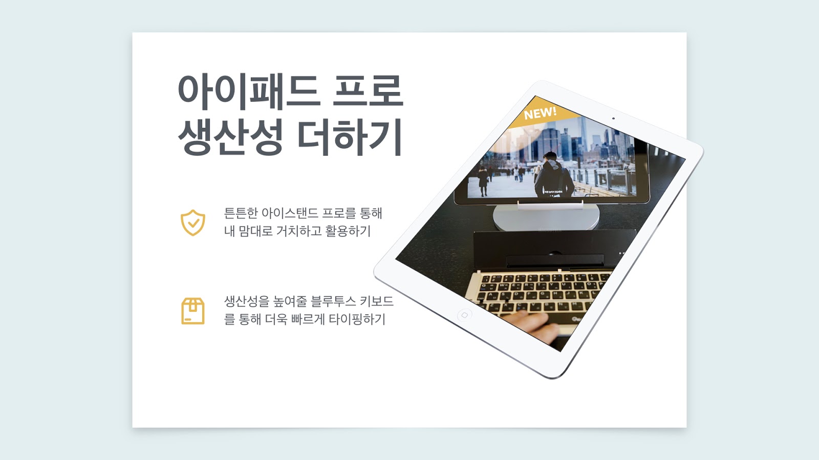 아이패드 프로를 자유자재로 거치할 수 있는 아이스탠드 프로를 통해 고급스러움과 편리한 실용성을 모두 활용해볼 것을 추천하며, 동시에 손이 닿는 곳에 오뉴 울트라슬림 접이식 블루투스 키보드를 놓아서 편리한 타이핑을 해볼 것을 추천한다.