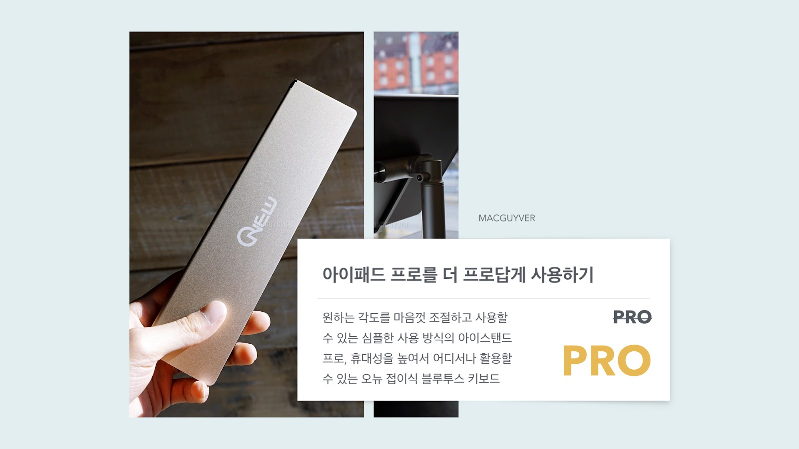 그래서 더욱 서드파티 액세서리가 중요하다. 나에게 맞는 최적의 각도로 아이패드를 사용할 수 있는 도구가 있다면, 휴대성이 높으면서도 스마트폰을 거치하거나 9.7형 아이패드 프로까지 거치할 수 있는 편리한 블루투스 키보드가 있었으면 하고 고민하고 있었던 분이라면 Momax 아이스탠드 프로와 오뉴 울트라슬림 접이식 블루투스 키보드를 알아볼 것을 추천한다. - MACGUYVER.