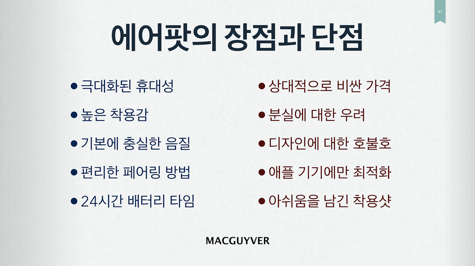그것이 바로 애플의 영악한 전략이었을 것이고, 에어팟을 선택한 26%의 소비자들이 모두 틀린 것은 아님을 뜻하는 것은 아닐까 싶은 이유다. - MACGUYVER.