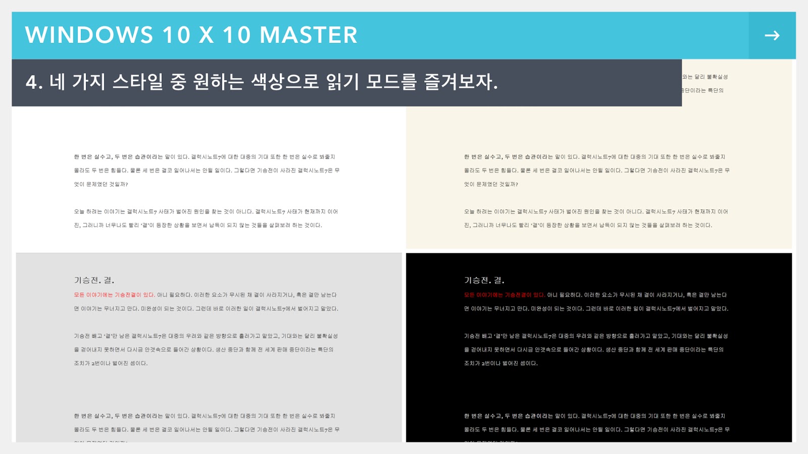 배경은 편안한 색감을 사용하면서도 글자와 사진은 원래의 색감을 유지하고 있기 때문에 왜곡없이 선명하게 컨텐츠를 즐길 수 있고, 무엇보다 광고나 부수적인 것들에 시선을 빼앗기지 않고 컨텐츠에만 집중할 수 있다.