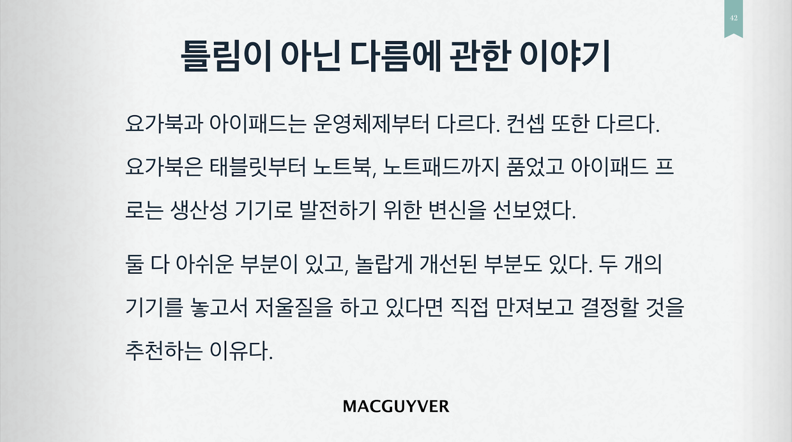 사운드는 두 기기 모두 비슷할 정도로 만족스러웠다. 휴대성 또한 두 기기 모두 충분히 좋았기 때문에 윈도우 운영체제를 필요로 한다면 요가북을, iOS에서 생산성 작업과 스케치를 하려는 목적이라면 아이패드 프로 9.7이 좋은 선택이 아닐까 싶었다. - MACGUYVER.