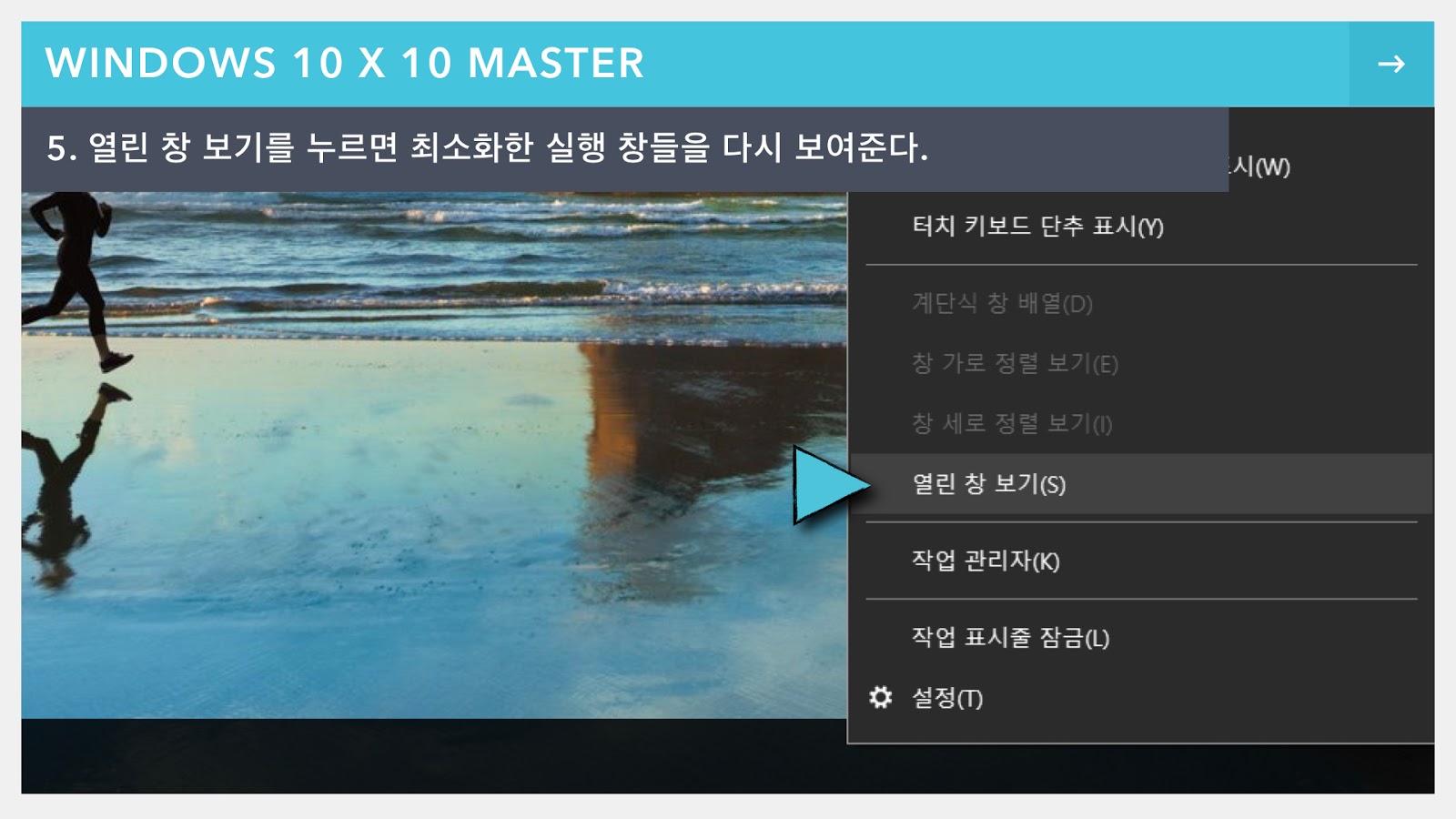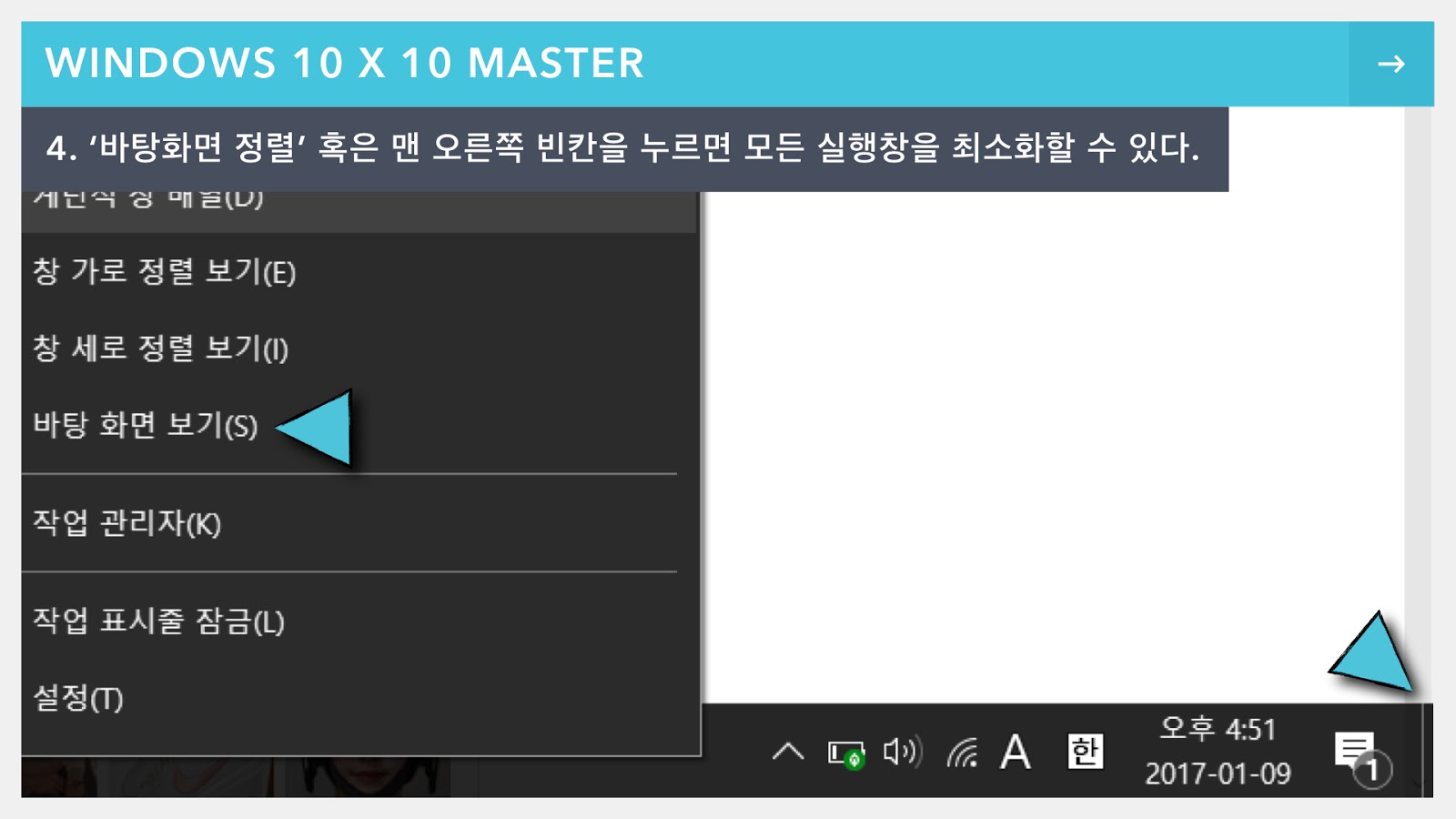 이 작업표시줄의 기능들은 여러 창과 탭을 번갈아가며 작업해야 하는 사람들에게, [Windows] + [방향키]와 함께 사용하면 꽤나 유용하다.