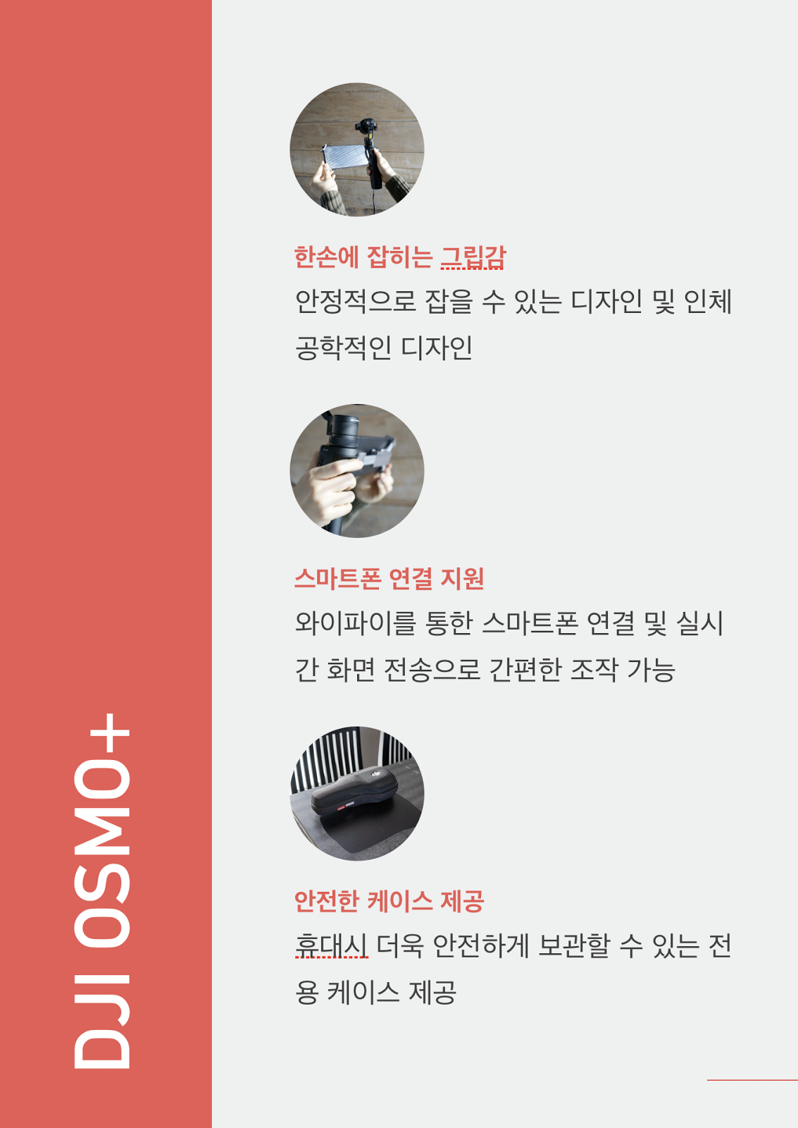 하지만, 처음보다 더 마음에 들었던 기기를 꼽으라면 DJI 오즈모+ (오즈모 플러스)가 있는데 첫인상은 사실 내가 이 녀석을 감당할 수 있을까 하는 걱정과 우려였지만, 몇 번 사용하다 보니 오즈모만의 매력이 느껴졌고 일반적인 스마트폰으로는 쉽게 담을 수 없는 영상까지도 손쉽게 담을 수 있다는 점이 가장 놀라웠다.