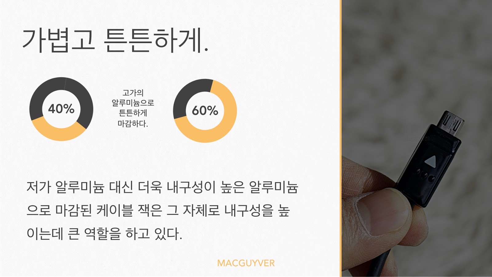 그러나 일부 제품은 안정적이지 못하고 매우 얇거나 끝의 알루미늄이 쉽게 휘어지고 녹이 생기는 경우를 많이 봤는데, 주파집 5핀 고속 충전 USB 케이블은 알루미늄도 고가의 알루미늄을 사용하며 내구성과 강도를 훨씬 더 높였기 때문에 더욱 믿고 쓸 수 있는 제품이 되어줬다.