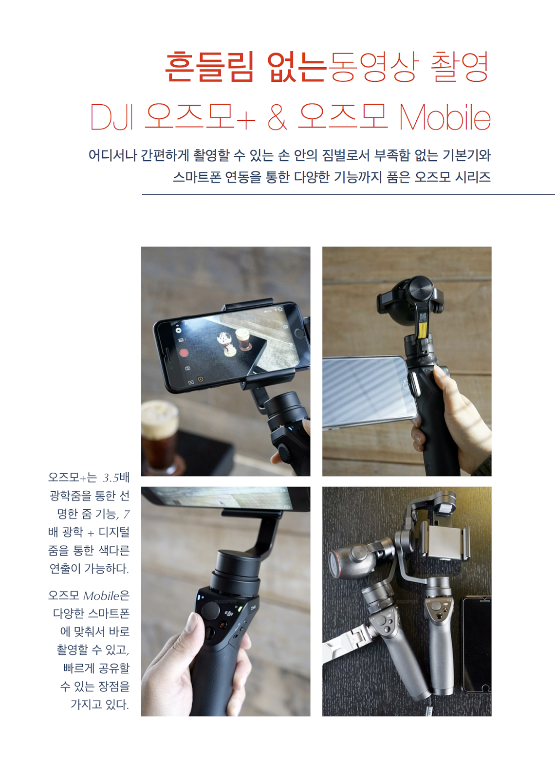 생각보다 빠르게 연결이 가능할 뿐 아니라 훨씬 더 편리하고 직관적으로 찍을 수 있다는 점에서 차별화가 되었던 DJI 오즈모+와 DJI 오즈모 Mobile은 그 자체로 색다른 경험을 선사해줬다.
