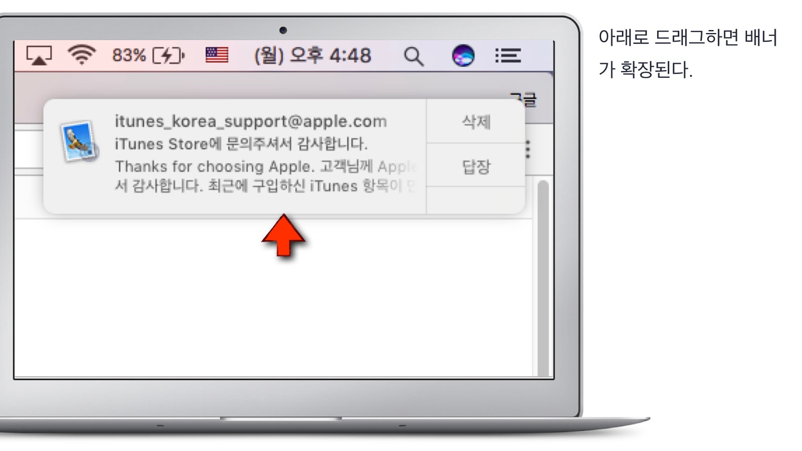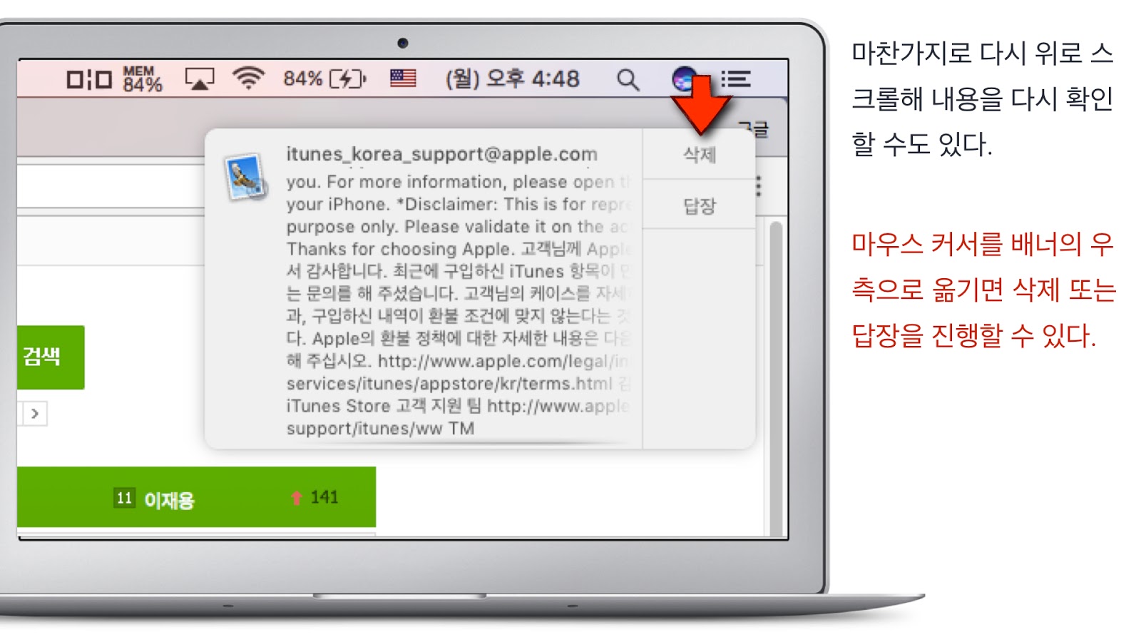 사실 맥북을 포함해 컴퓨터에 메일이나 메시지 알림을 설정해뒀다면 수신한 메일을 알림 배너로 확인하고 바로바로 답장하거나 삭제할 수 있다. 그 앱을 실행시키지 않고도.