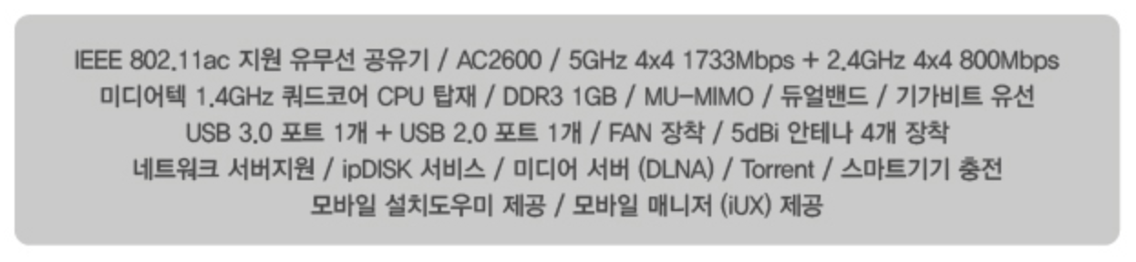 개인적으로 놀라웠던 기술이라면 MU-MINO가 있는데, 동시에 여러 기기에서 인터넷을 할 경우 당연히 발생하게 되는 속도 하락을 억제해서 최대 2배에 이르는 속도를 체감하게 해준다는 점에서 실사용시 혜택이 큰 기술을 품고 있기도 했고, 2개의 USB 단자를 통해 NAS 서버로 활용하거나 스마트기기를 충전하고, 테더링으로 인터넷을 하는 일까지 해내는 똑똑한 기술까지 품은 제품이라는 점 역시 장점이 되어줬다.