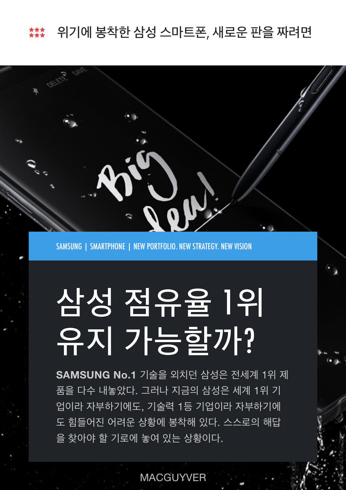 지금 삼성이 위태로운 것은 단순히 수치상으로 드러나는 전세계 스마트폰 판매량 1위라는 타이틀이 아니다. 평균 판매 단가의 하락을 비롯해 중저가폰에서의 침체, 아시아권에서의 침체, 프리미엄 제품군에 대한 불신까지 이어진 총체적인 문제라 부를 수 있다.