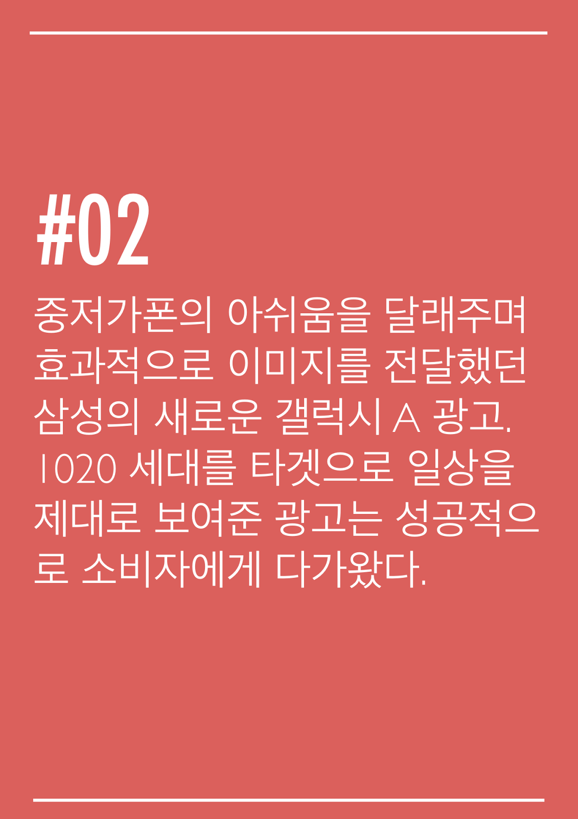 놀라운 것은 광고를 보기 이전에 떠올리던 갤럭시 A라는 이미지와 광고를 보고 난 이후에 느껴지는 갤럭시 A에 대한 이미지가 완전히 다르다는 것에 있다.
