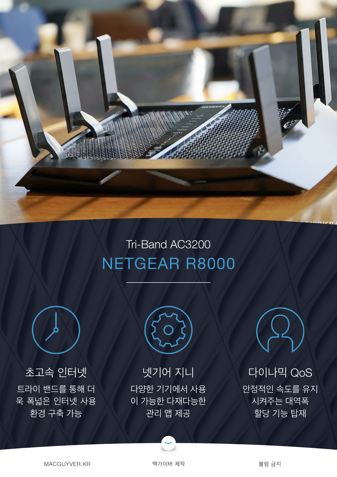 NETGEAR R8000은 특유의 디자인으로 인해 어디에 놓아두어도 시선을 집중하게 만들어줬을 뿐 아니라 그것을 뛰어넘는 퍼포먼스로 인터넷 시대에 적합한 유무선 공유기라는 생각이 들게 만들어줬다. 제법 큼지막하고 묵직한 어댑터만 보더라도 안정적인 구동을 위한 많은 준비를 했음을 알게 해줬던 NETGEAR R8000 나이트호크 유무선 공유기를 통해 업무 효율을 높여볼 것을 추천한다. - MACGUYVER.