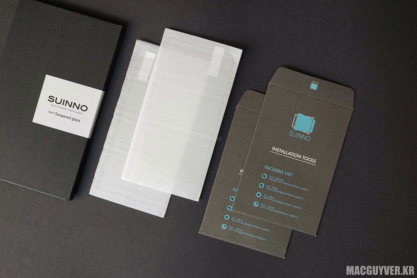 실제로 사용해본 슈이노 1+1 강화유리필름은 포장이 매우 훌륭했고, 이 가격대라고 믿기지 않을 정도의 꼼꼼한 구성과 놀라운 품질을 보여줬다. 물론, 슈이노 0.1mm 모델과 비교하자면 두께감은 살짝 있었지만, 많이 두꺼운 정도는 아니었고 무엇보다 화면이 깨끗하게 보인다는 점과 라운딩 처리로 부드러운 손맛을 제공했다는 점에서는 합격점을 주기에 충분했다. - MACGUYVER.