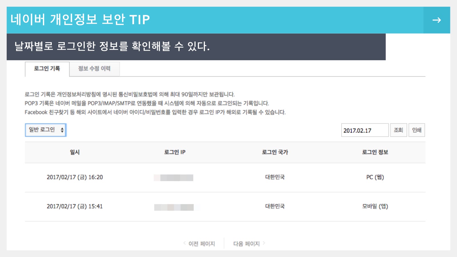 이를테면 언제, 어디서, 어느 기기로 네이버 계정을 사용했는지, 날짜별로 알아볼 수 있다.