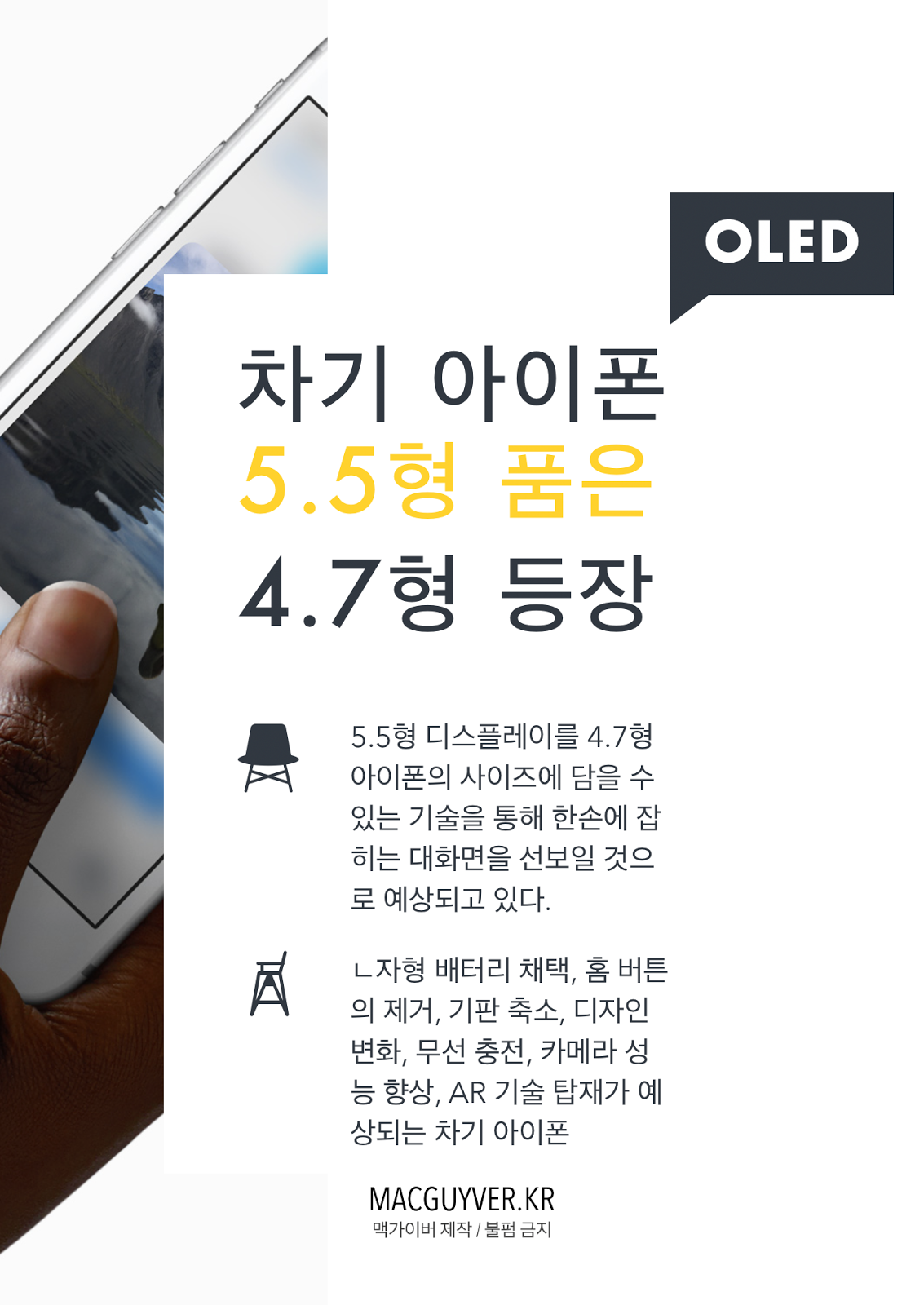 만일 애플이 이러한 변화를 선보인다면, 아이폰8 혹은 아이폰7s는 역대 가장 큰 변화를 선보이는 아이폰이 될 것으로 보이며, 이러한 변화를 통해 애플은 다시금 한손에 잡히는 아이폰 혹은 더 많은 콘텐츠를 한 화면에 담아내는 기술을 대대적으로 선보일 가능성이 높다.