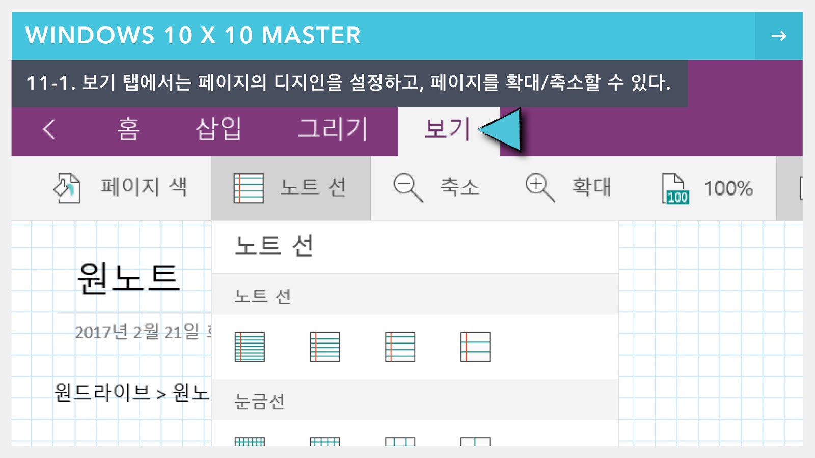 그리고 보기 항목에서는 노트 페이지의 디자인을 설정할 수 있다. 배경의 색감, 선의 종류 등을 선택할 수 있고, 페이지를 확대/축소할 수도 있다.