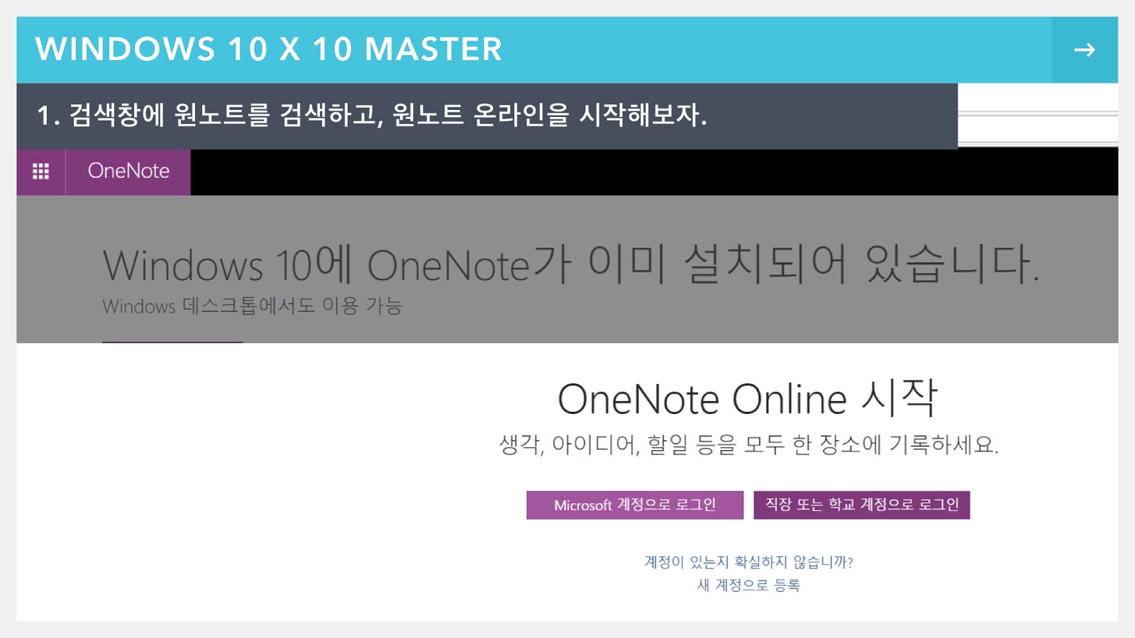 참고로 원노트를 검색해서 MS 사이트에 들어가 보면 원노트 2016, 윈도우 용 원노트, iOS 용 원노트 등 여러 명칭 있어서 헷갈릴 수 있는데, 오늘은 간단한 구성을 지닌 ‘원노트 온라인’에 대해 살펴볼 것이니, 검색창에 ‘원노트 온라인’을 검색하고, 실행해보자.