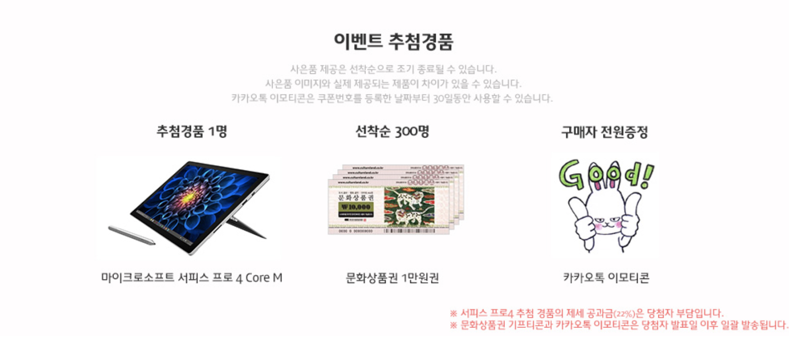 당첨 상품 역시 막강했는데, 앞서 살펴봤던 문화상품권이나 카카오톡 이모티콘에 더해, 1명에게 마이크로소프트의 서피스 프로4를 증정하기 때문에 더욱 좋은 기회가 될 것 같았다.