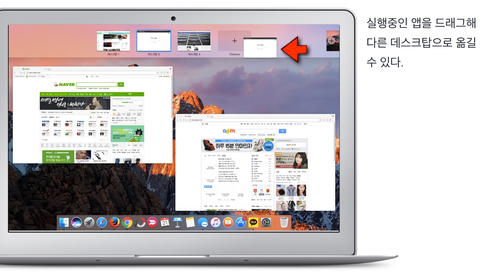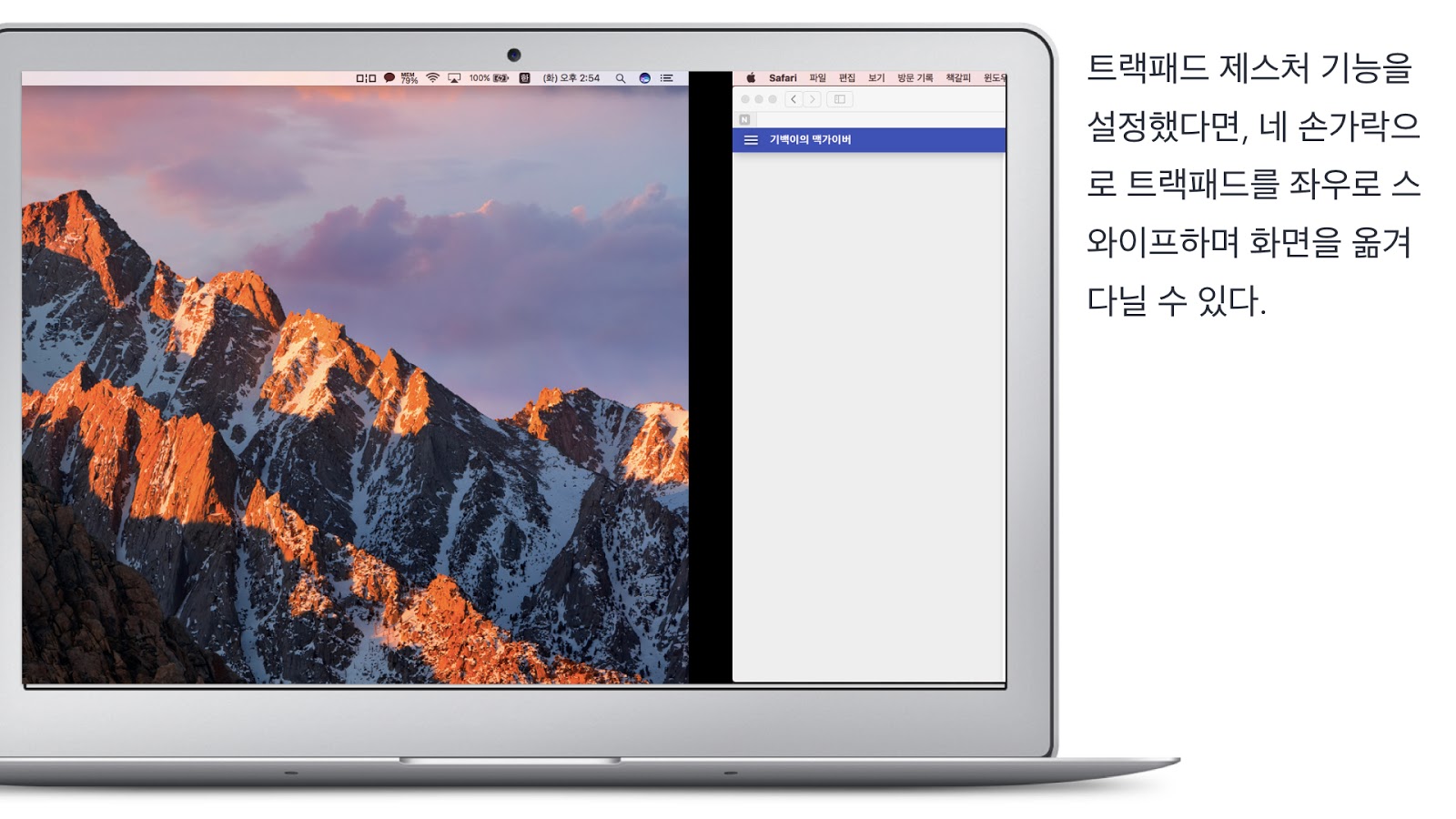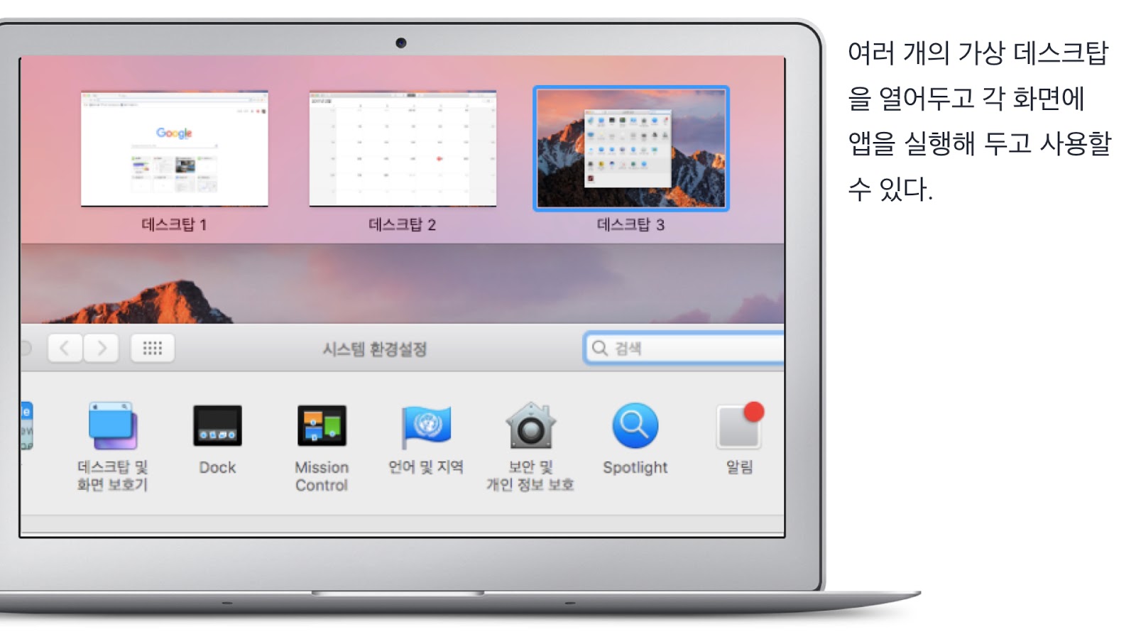 트랙패드 제스처를 이용한 데스크탑 전환과 미션컨트롤만 능숙하게 활용한다면, 여러 가지 앱을 딜레이 없이 생산적으로 사용할 수 있을 것이다.