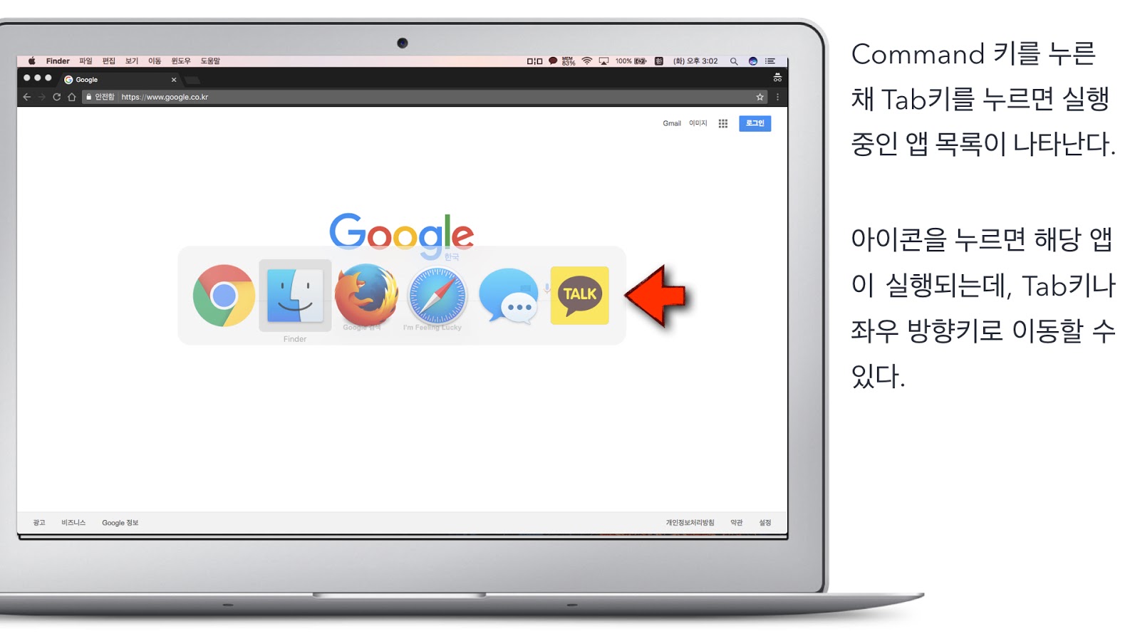 [Command]키를 누른 채 [tab]을 누르면 한 패널에 실행 중인 앱의 아이콘들이 나타난다. 이 단축키를 사용해 여러 앱 들 간의 빠른 전환을 할 수 있는데, 마우스로 클릭해도 되고, 좌우 방향키나 [Tab] 키를 사용해서 이동할 수도 있다.