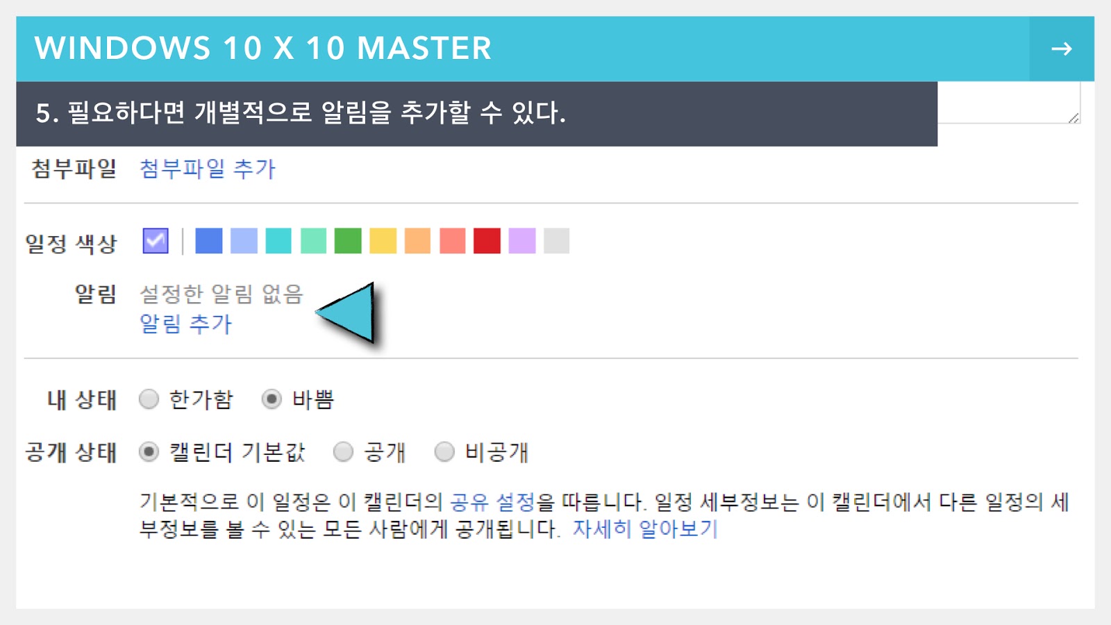물론 이 설정은 알림 기능을 아예 비활성화하는 것이 아니기 때문에 일정마다 개별적으로 알림을 추가할 수 있다.