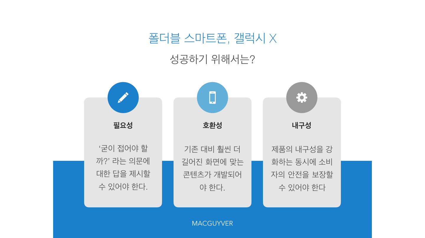 중요한 것은 소비자들이 만족할만한 수준의 완성도를 보여주는 것이고, 기존의 스마트폰은 보여주지 못했던 가치를 제공하는 것이다. 과연 삼성이 어떠한 방식으로 이러한 난제들을 해결하게 될지, 또한 올해 하반기 가장 기대가 되는 갤럭시 X의 출시가 이뤄질 수 있을지 관심을 가지고 지켜봐야겠다. - MACGUYVER.