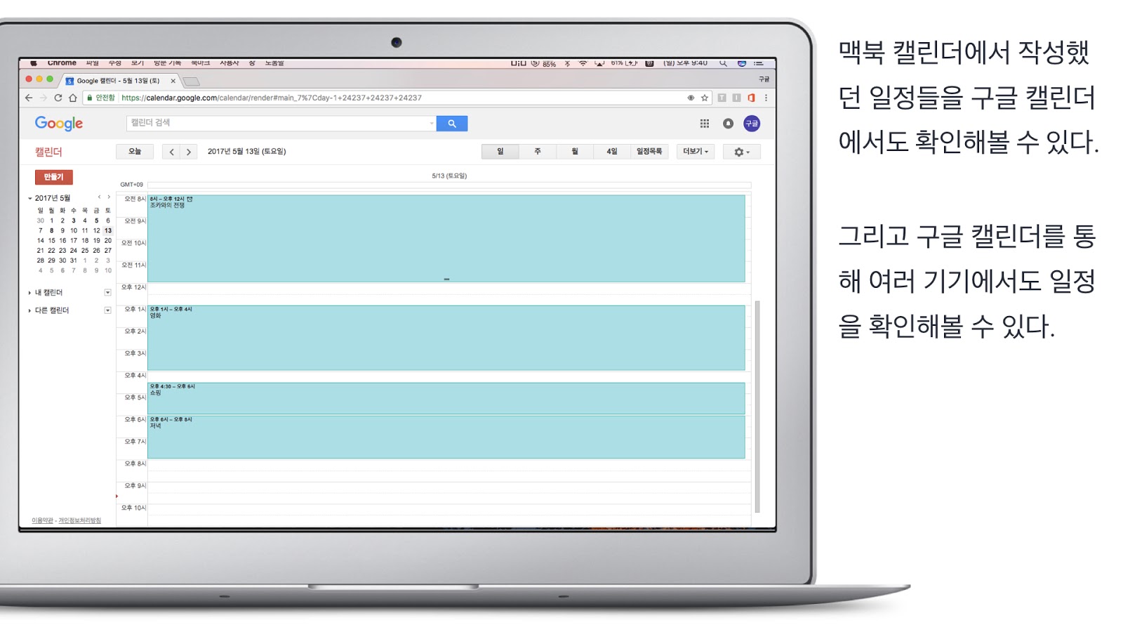 그 덕분에 맥북에서 작성한 일정을 구글 캘린더를 통해서 그램이나 서피스처럼 다른 기기에서도 일정을 확인해볼 수 있는 것이다.