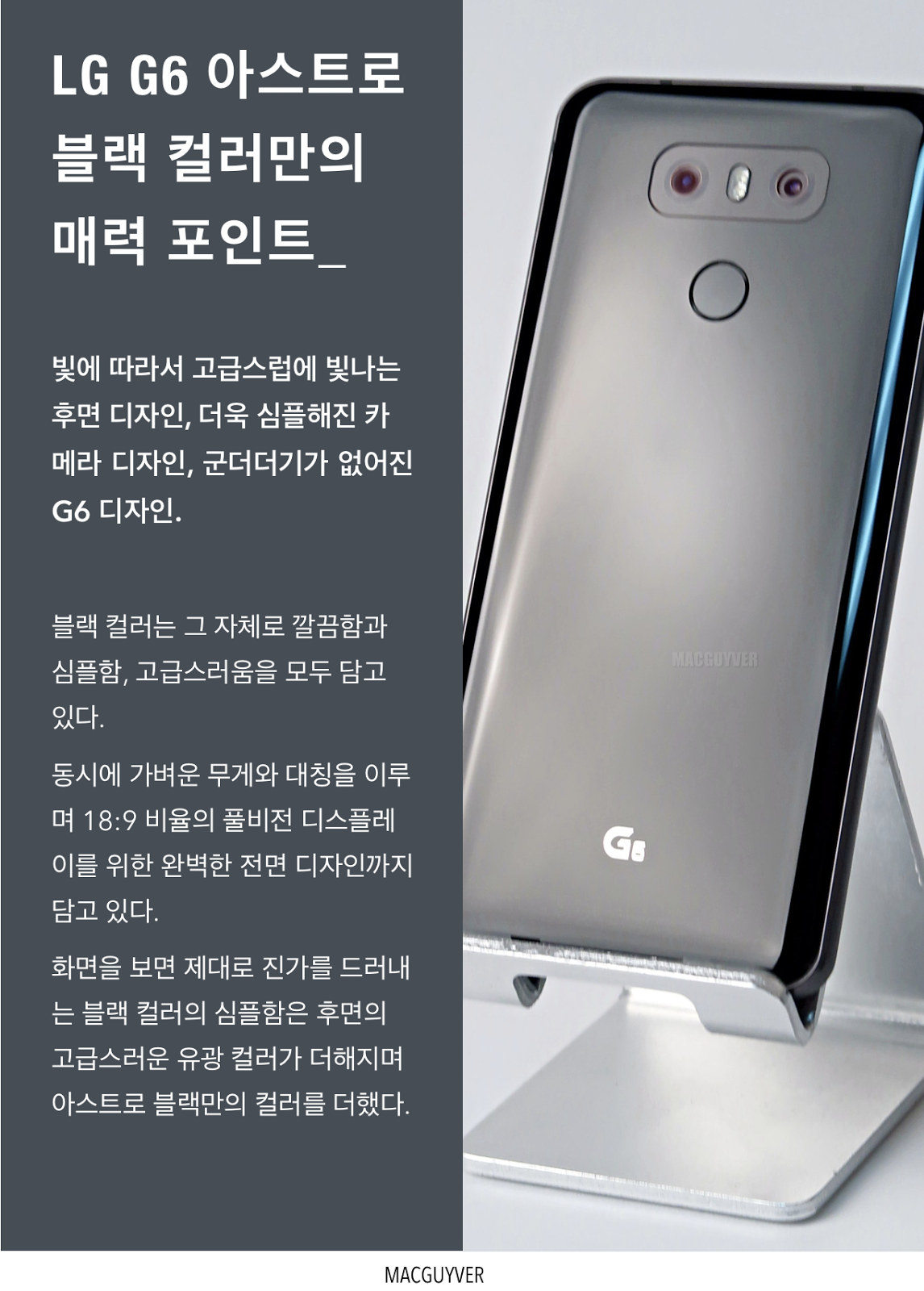 솔직하게 평가하자면 아스트로 블랙 컬러 보다는 아이스 플래티넘이 2배는 더 매력적으로 다가왔다. 그러나 G6의 아스트로 블랙 컬러 역시 제트 블랙에는 미치지 못했을지라도 전에 알던 엘지 스마트폰은 가볍게 넘어선 컬러 및 마감, 디자인은 엘지 스마트폰의 체급 변화가 있었음을 제대로 전달해줬음은 틀림이 없어 보였다. - MACGUYVER.