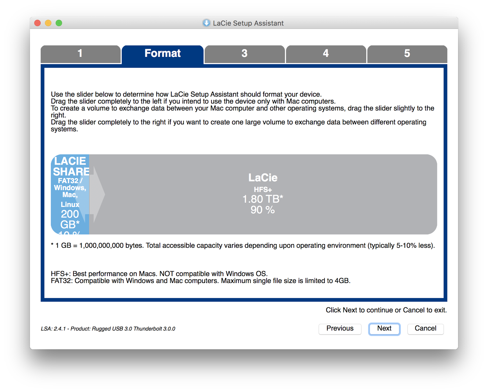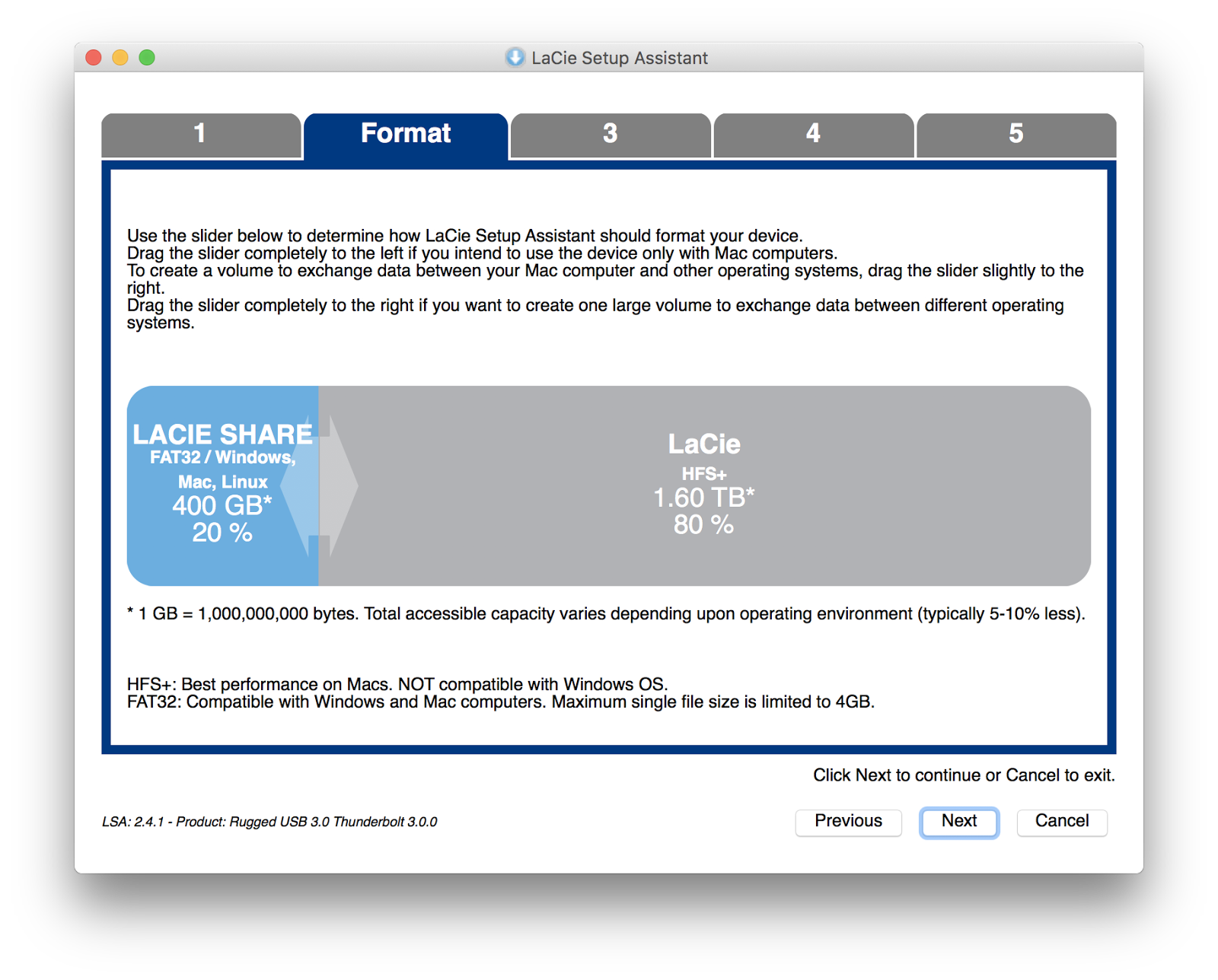 라씨 러기드 썬더볼트 2TB 외장하드가 독특한 이유는 바로 USB 3.0의 빠른 속도에 더해서 썬더볼트까지 지원하는 것 때문인데, 맥 외장하드를 베이스로 만들어진 만큼, 처음 라씨 러기드 썬더볼트 2TB 외장하드를 맥북과 연결하게 되면 별도의 소프트웨어 창을 통해서 포맷을 진행할 수 있다.
