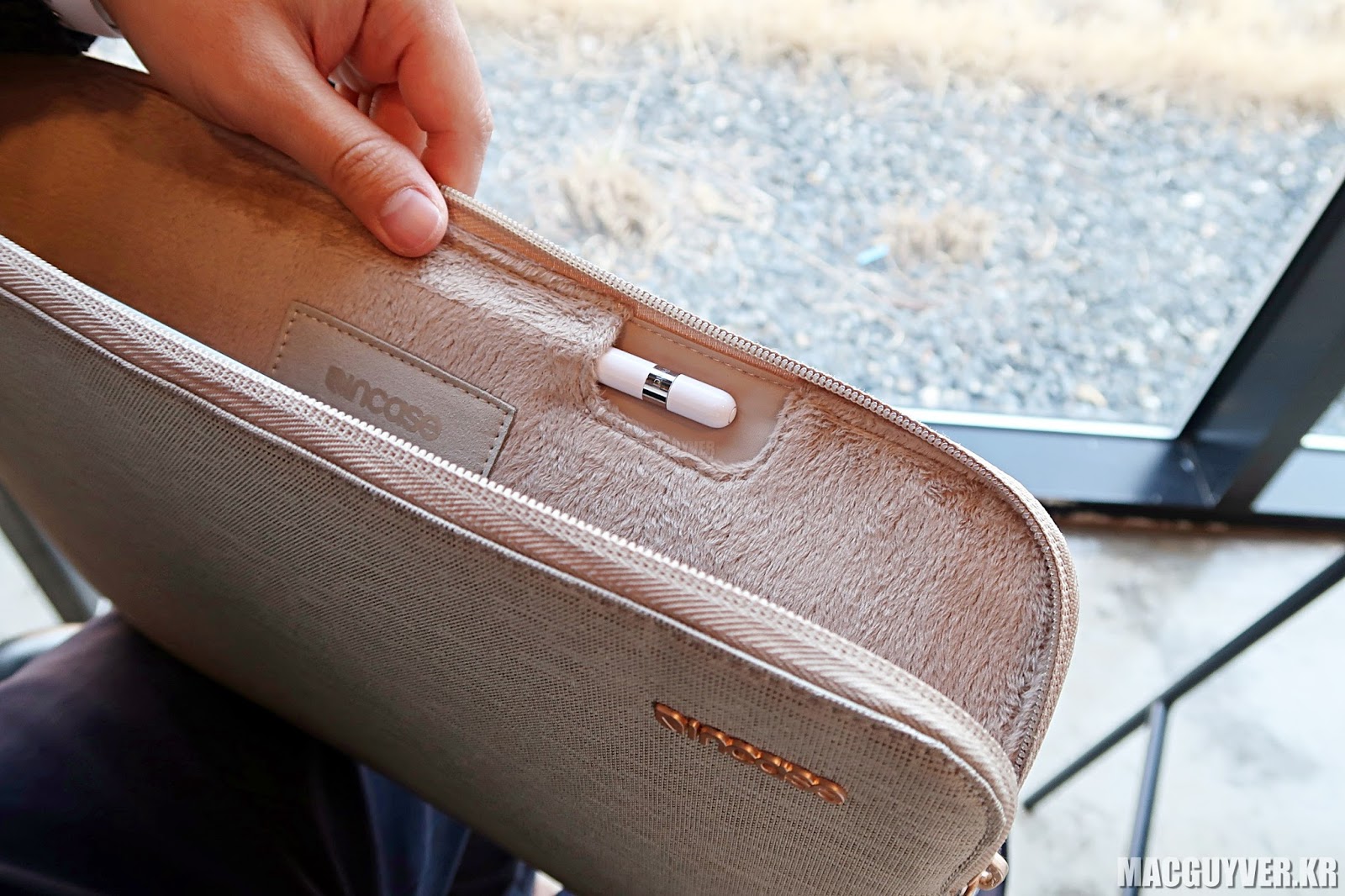 물론, 아쉬움이 없을 수는 없기 때문에 인케이스 슬림 슬리브 with 애플 펜슬 제품의 단점을 짚어보자면, 우선 애플 펜슬을 넣는 곳의 높이가 아이패드를 넣는 곳과 거의 같아서 펜슬을 넣을 경우 살짝 튀어나오는 등판이 눈에 거슬리기도 했다. 1cm 정도만 여유를 더 줬더라면 아이패드와 맞붙지 않고 애플 펜슬을 거치할 수 있지 않았을까 싶었지만, 이 부분은 차기 제품에서 개선되지 않을까 싶었다.