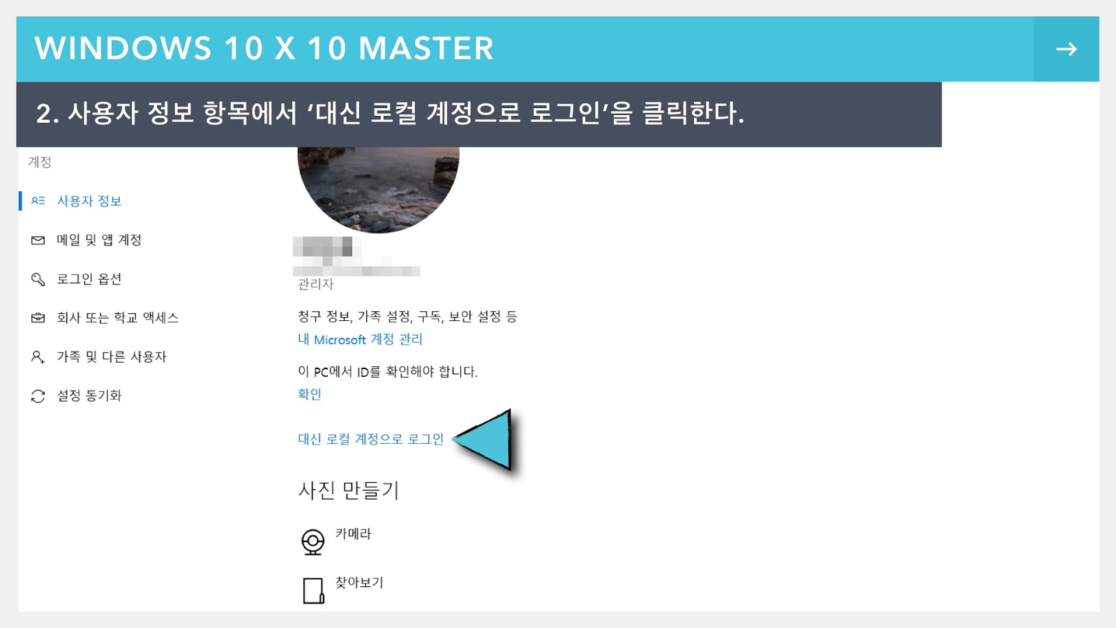 만약 로그인 시 사용하는 계정이 마이크로소프트 계정이라면, 노트북을 사용할 때마다 긴 비밀번호로 타이핑하기가 귀찮았다면, 로컬계정으로 바꾸는 것도 한가지 방법일 수 있다.
