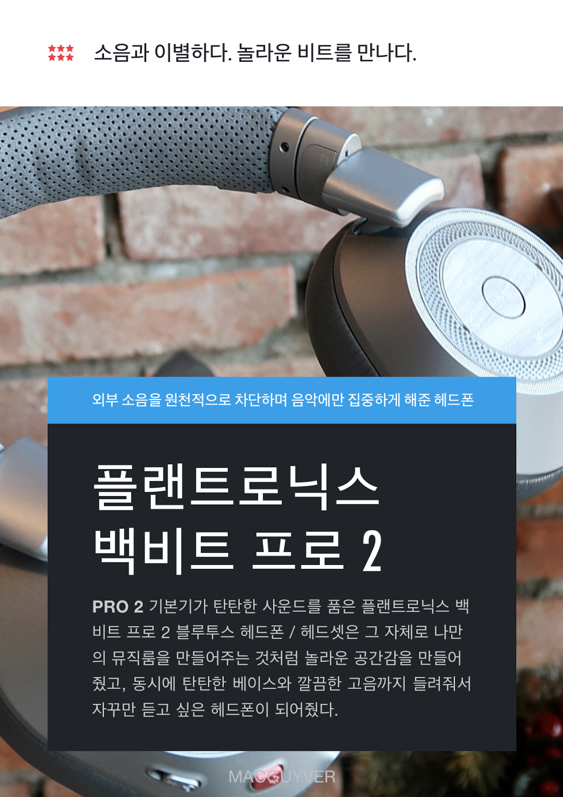 플랜트로닉스 블루투스 헤드폰 ‘백비트 프로 2’는 단순히 글만으로는 표현이 힘든 제품이었다. 일반적인 헤드폰과 비교하자면 급이 3단계는 향상된 것처럼 놀라운 비트와 사운드를 들려줬을 뿐 아니라 오래가는 배터리로 충전에 대한 불편함까지 줄여줬기 때문에 헤드폰, 헤드셋의 구매를 고려중인 분들에게 꼭 추천하고 싶은 제품이었다. - MACGUYVER.