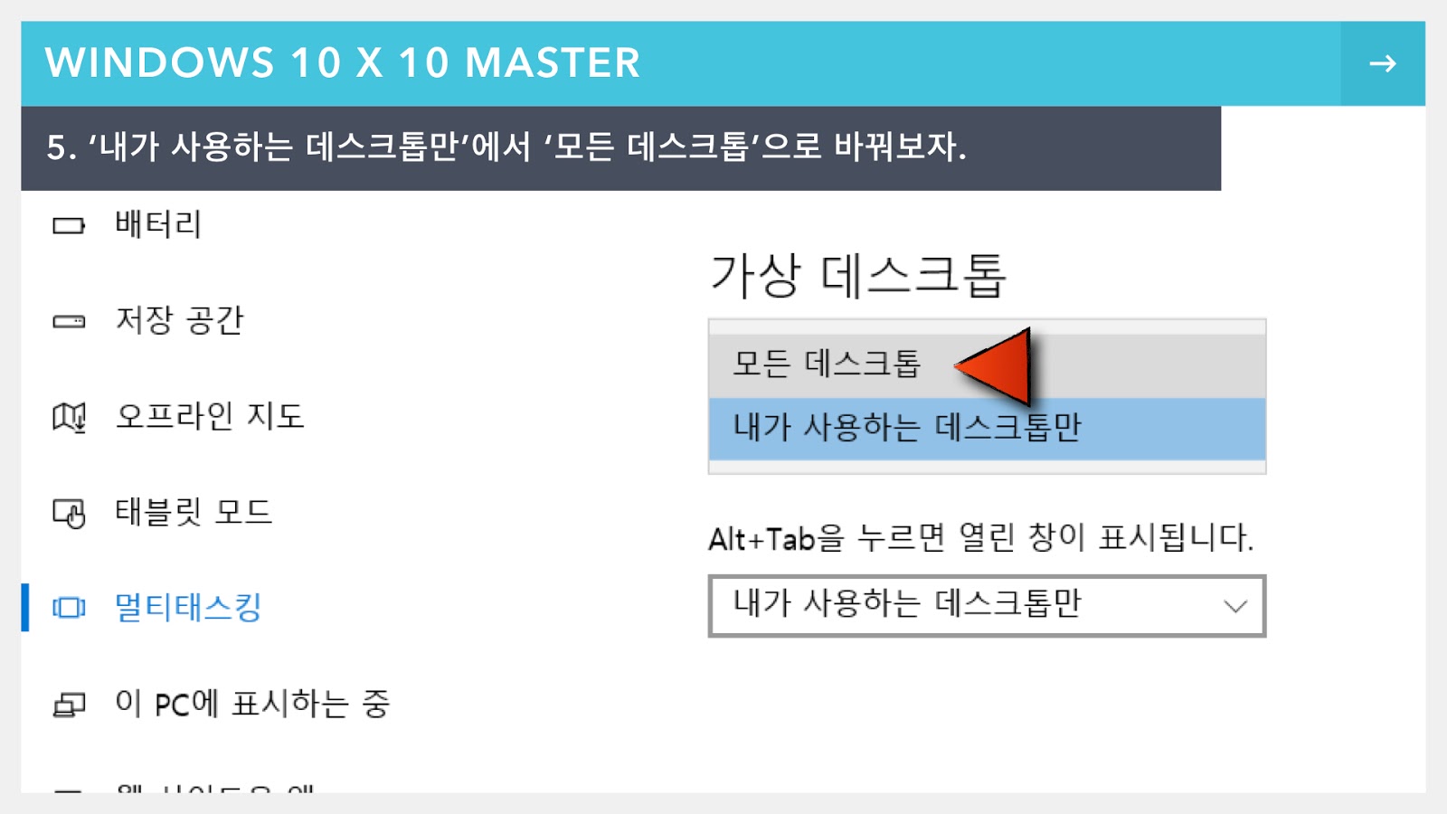 바로 작업표시줄에 현재 실행중인 모든 앱, 그러니까 다른 가상 데스크탑에서 실행 중인 앱들까지도 모두 표시하는 설정이다.