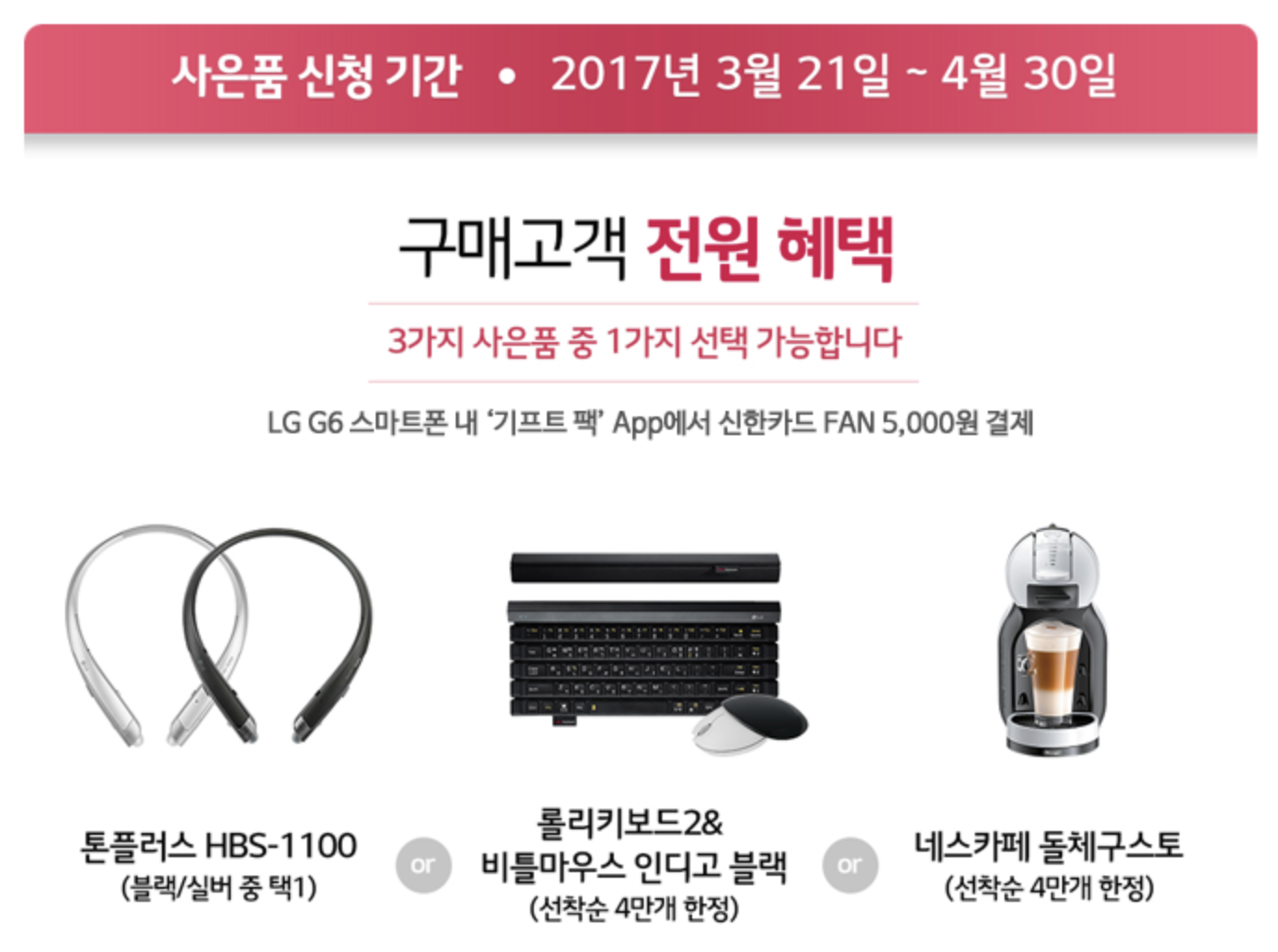 이전과 마찬가지로 G6는 비싼 출고가와 함께 상당히 비싼 사은품을 제공하고 있다. 무선 고음질을 구현한 톤플러스 HBS-1100이나 롤리키보드 & 비틀마우스, 또는 네스카페 돌체구스토 커피머신 가운데 한 세트를 증정하는 것인데, 문제는 그 방식과 제품군에 있었다.