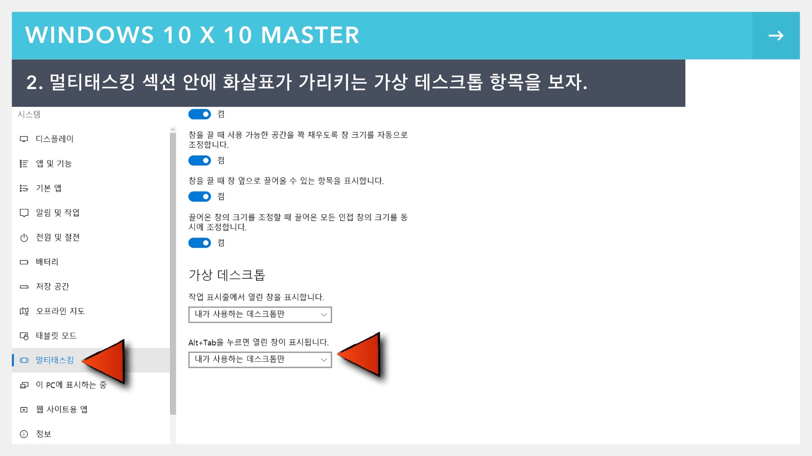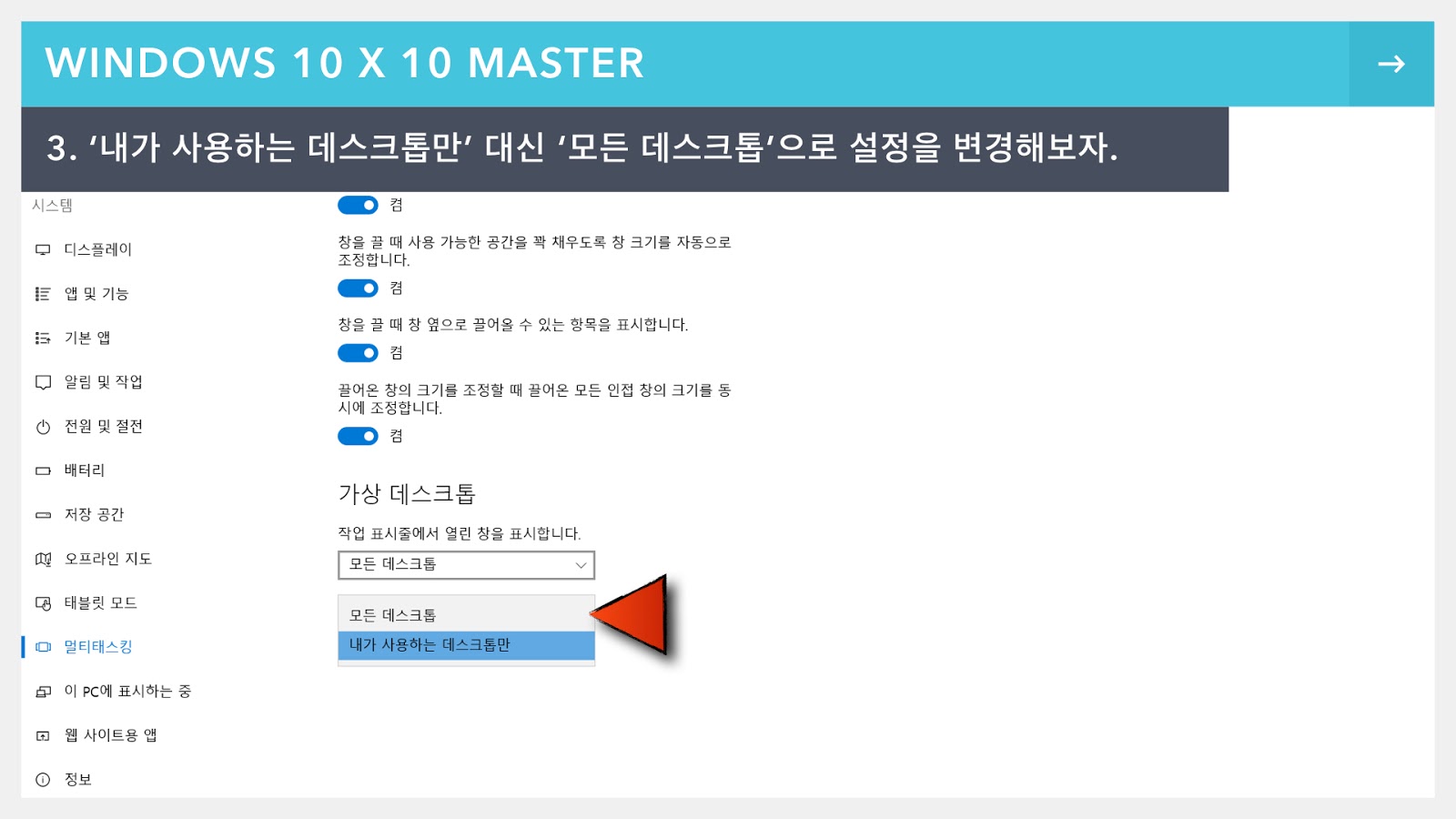 하지만 아래의 간단한 설정을 활용하면 알트탭의 범위가 현재의 가상 데스크탑에서 모든 가상 데스크탑으로 확장된다고 한다.