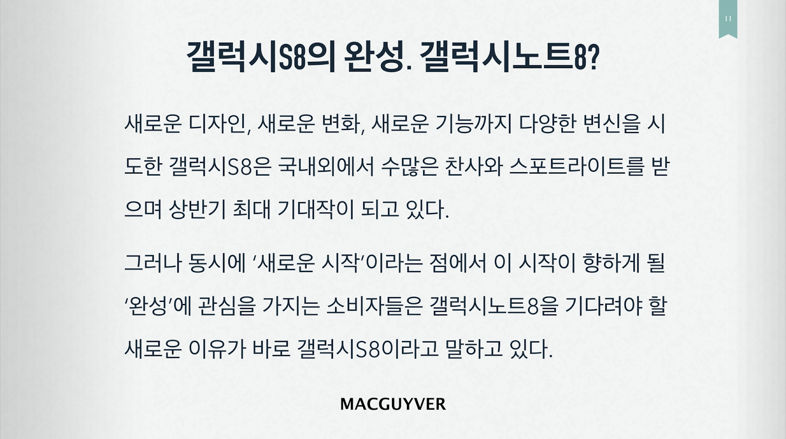 과연 삼성이 내놓은 갤럭시S8이 삼성에게 있어서 진짜 새로운 시작이 될 수 있을지, 그리고 삼성이 주장하는 ‘완성’이라는 단어를 붙이기에 갤럭시S8이 정말 놀라운 완성도를 가진 스마트폰이라 불릴 수 있을지 오는 정식 출시일을 지켜봐야겠다. - MACGUYVER.