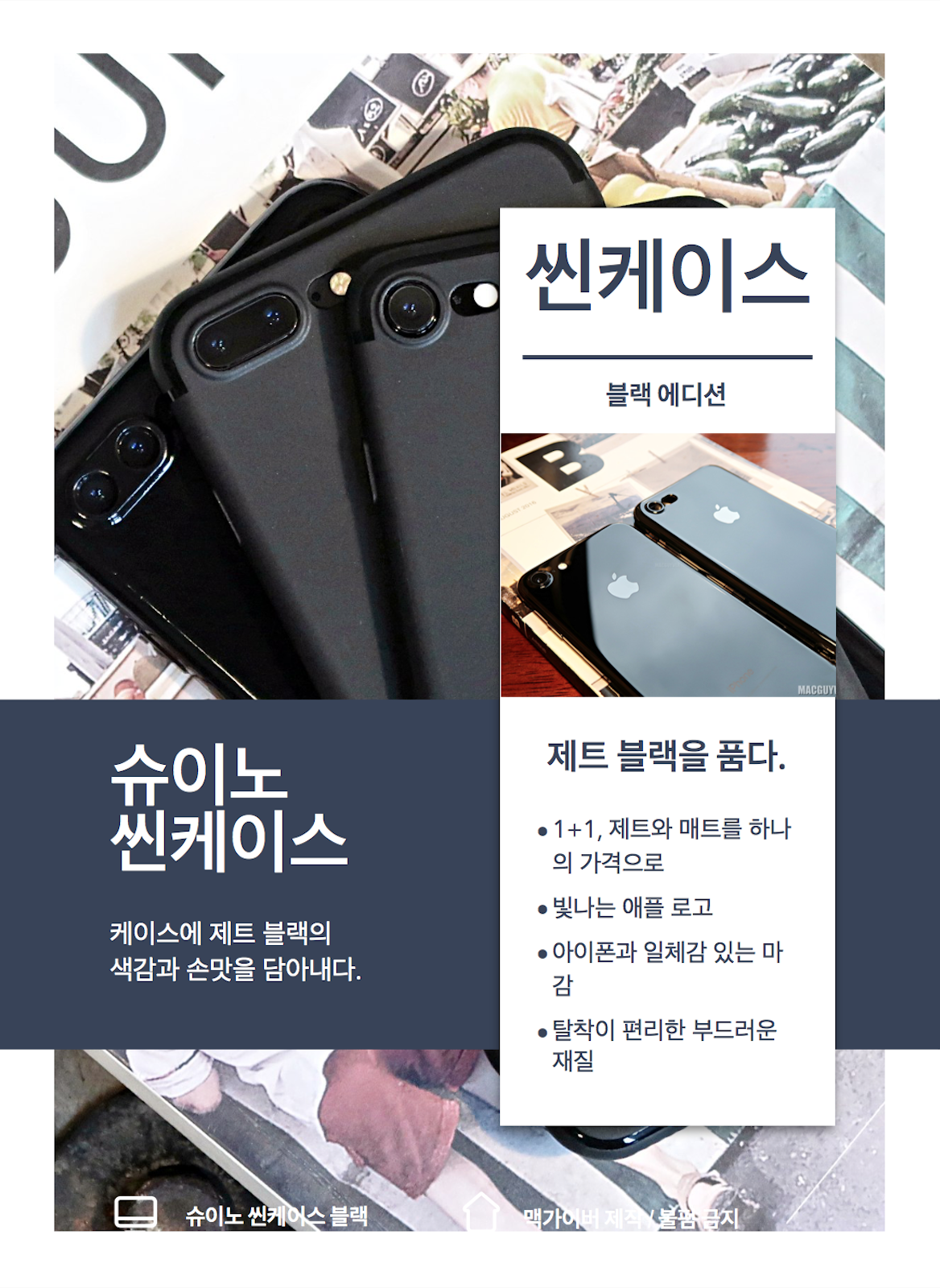 마치 아이폰7 제트 블랙과도 같은 느낌을 케이스가 소화해낸 것이죠. 그렇다면, 슈이노 씬케이스 블랙 에디션은 과연 어떤 케이스인지를 먼저 알아봐야겠죠?