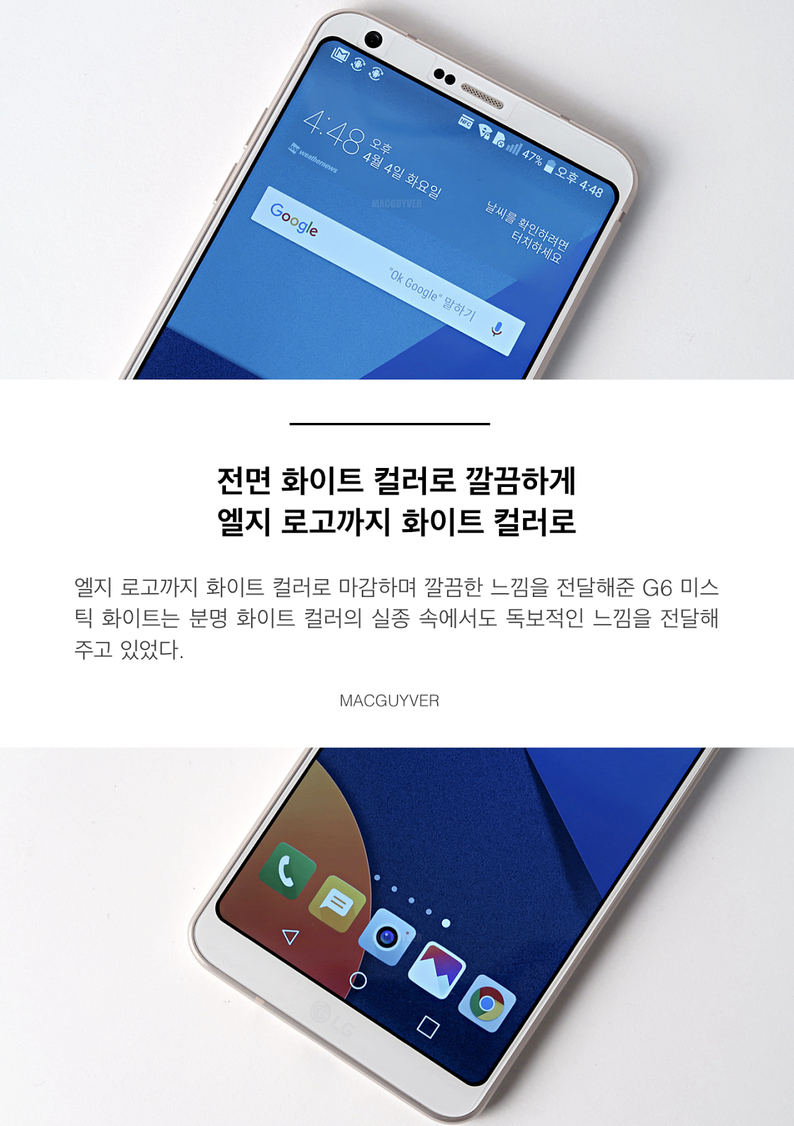 결론을 내려보자면, 여성분들이 선택하기에 더없이 좋은 컬러가 바로 G6 미스틱 화이트가 아닐까 싶네요. 후면 엣지 디자인과 한 손에 잡히는 작은 디자인을 통해 여성분들도 부담 없이 사용해볼 수 있었던 디자인을 갖췄기 때문입니다.